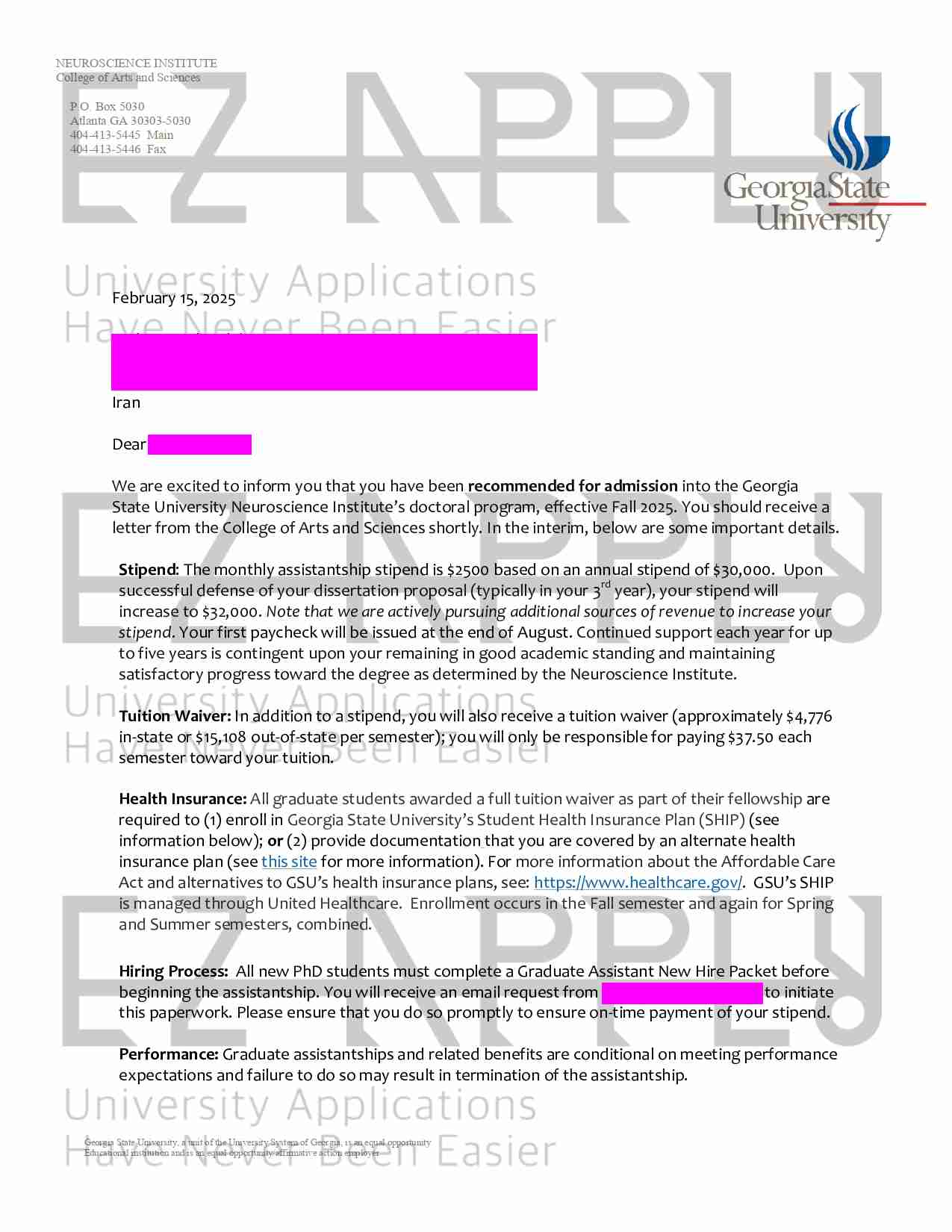 اخذ ادمیــشن فول فاند توسط تیم ایزی اپلای در مقطع «دکتری» در رشتهی «Neuroscience» از Georgia State University در آمریکا برای پاییز ۲۰۲۵