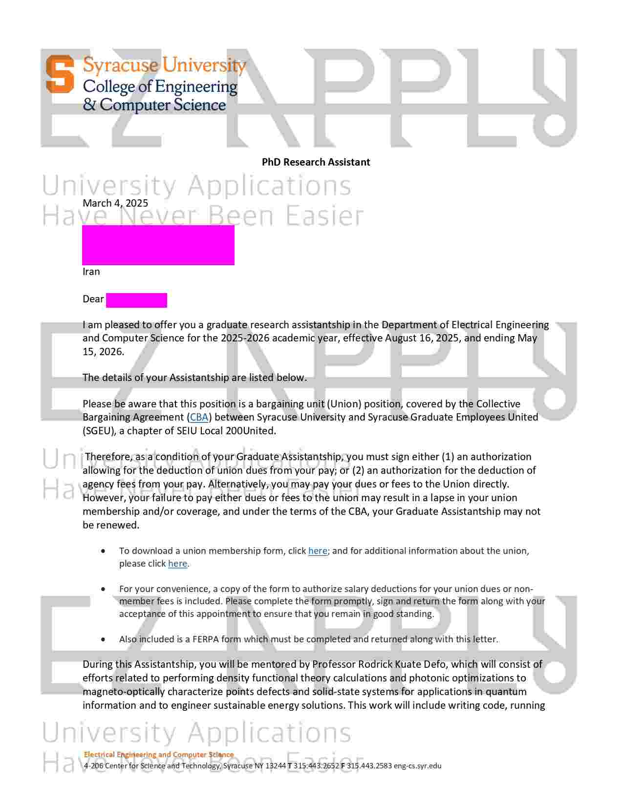 اخذ ادمیــشن فول فاند توسط تیم ایزی اپلای در مقطع «دکتری» در رشتهی «مهندسی برق و کامپیوتر» از Syracuse University در آمریکا برای پاییز ۲۰۲۵