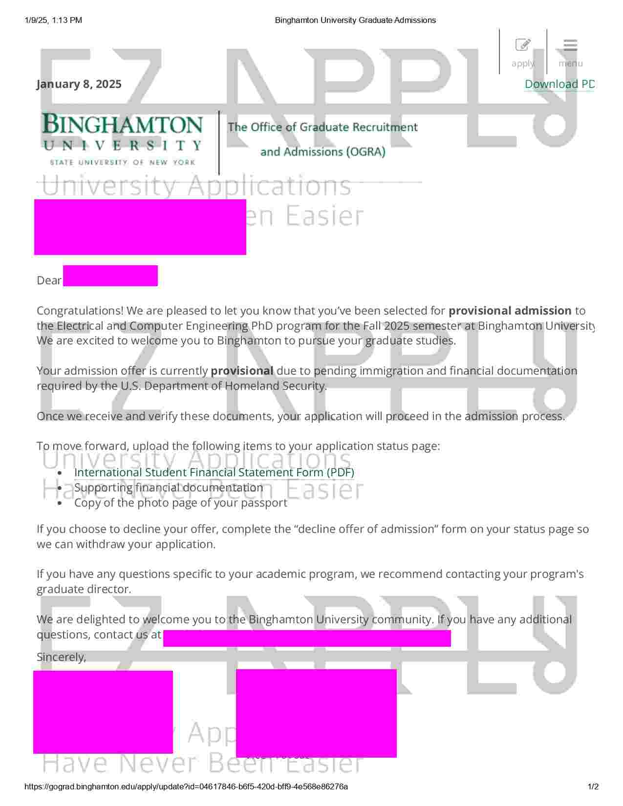 اخذ ادمیــشن توسط تیم ایزی اپلای در مقطع «دکتری» در رشتهی «مهندسی برق و کامپیوتر» از Binghamton University در آمریکا برای پاییز ۲۰۲۵