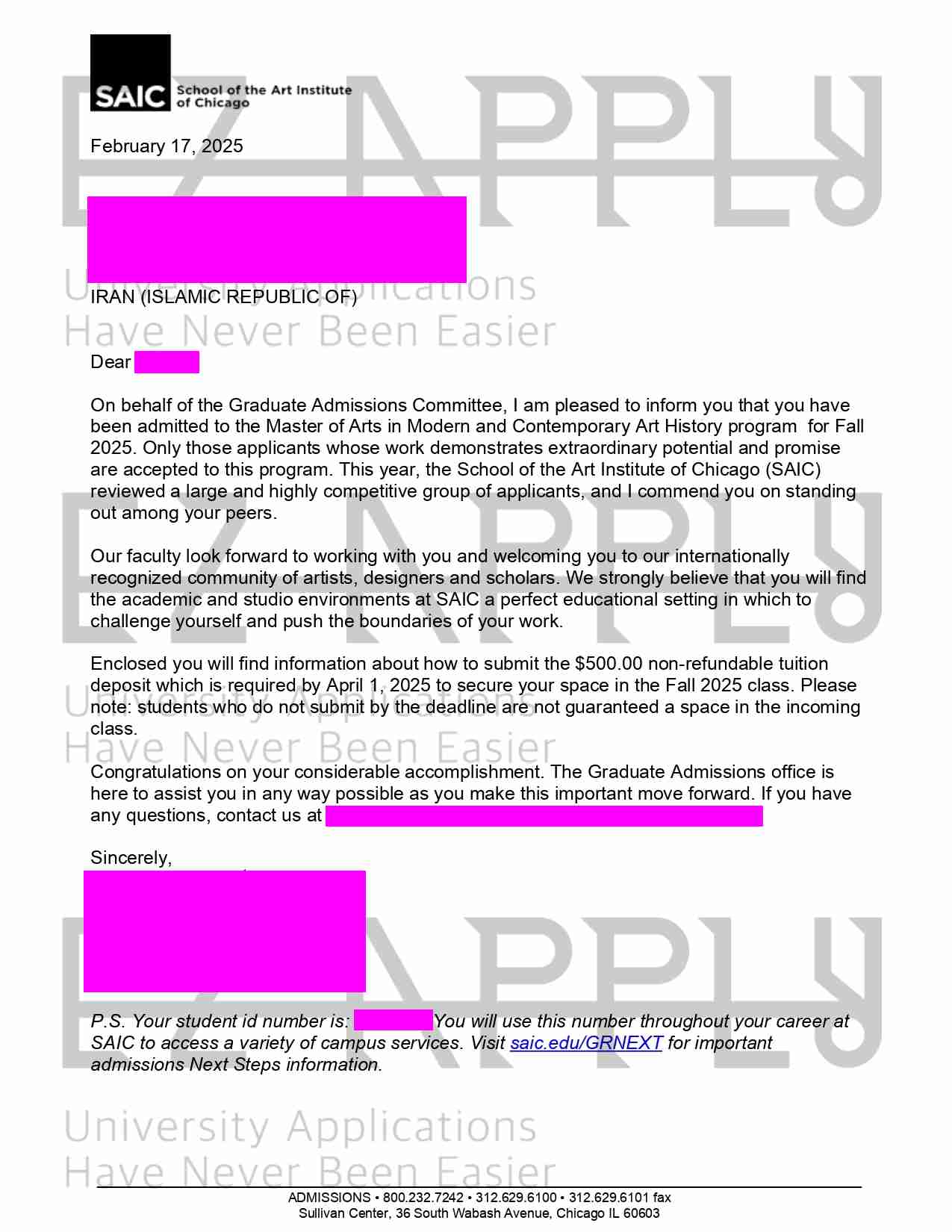 اخذ ادمیــشن توسط تیم ایزی اپلای در مقطع «کارشناسی ارشد» در رشتهی«Modern and Contemporary Art History» از School of the Art Institute of Chicago در آمریکا برای پاییز ۲۰۲۴