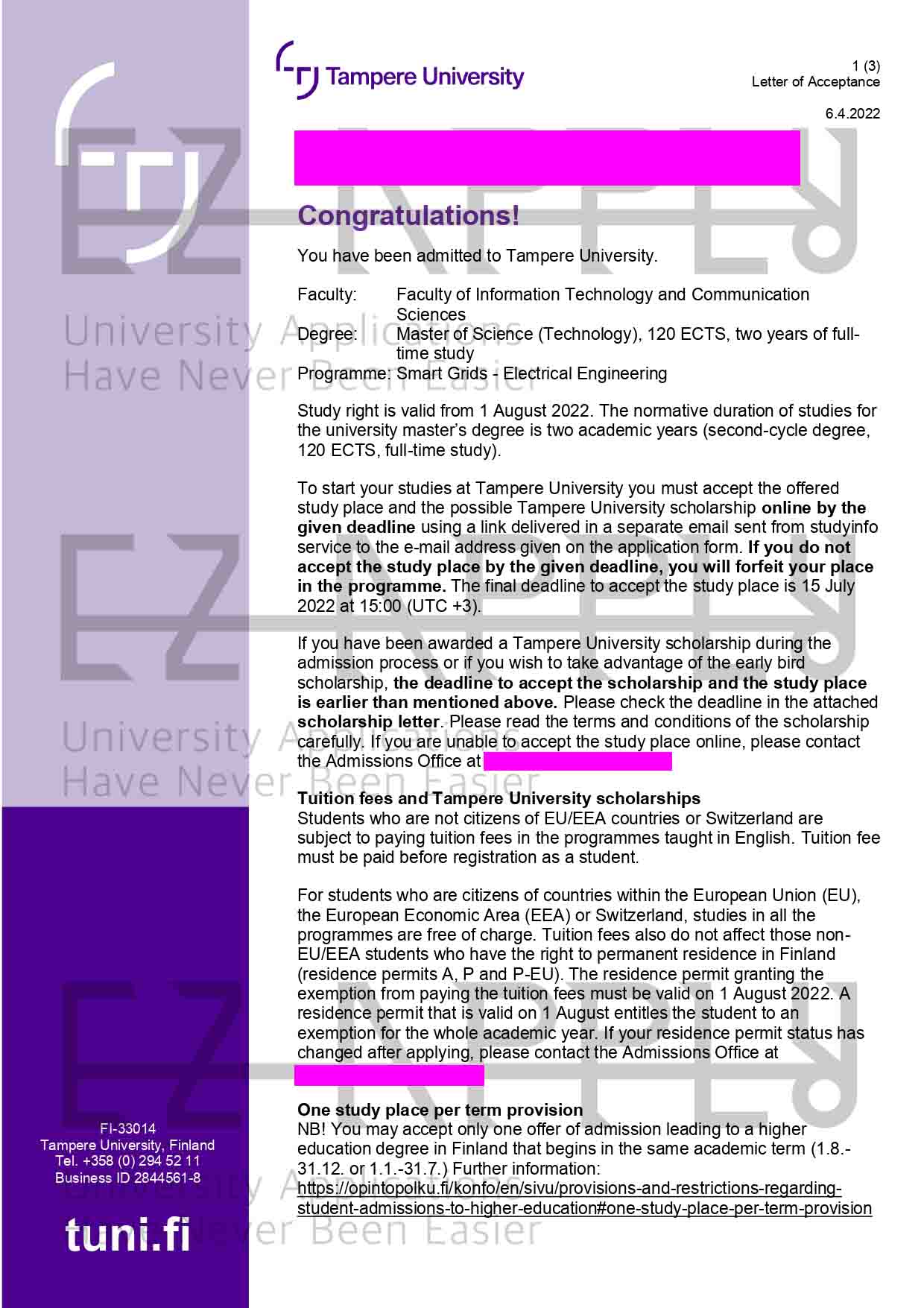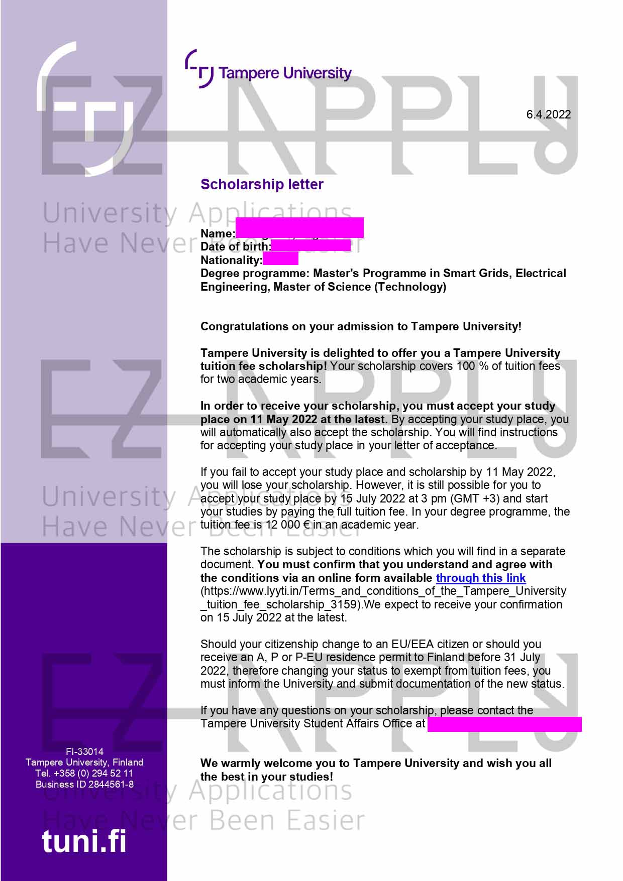 اخذ پذیرش با فاند توسط تیم «ایزی اپلای» در مقطع کارشناسی ارشد در رشته «مهندسی برق» از «Tampere University» در فنلاند برای پاییز 2022