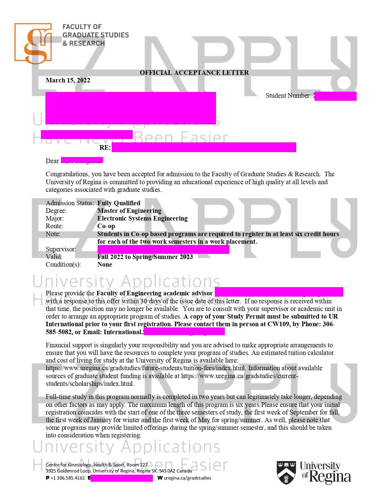اخذ پذیرش توسط تیم «ایزی اپلای» در مقطع کارشناسی ارشد در رشته «مهندسی برق» از «University of Regina» در کانادا برای پاییز 2022