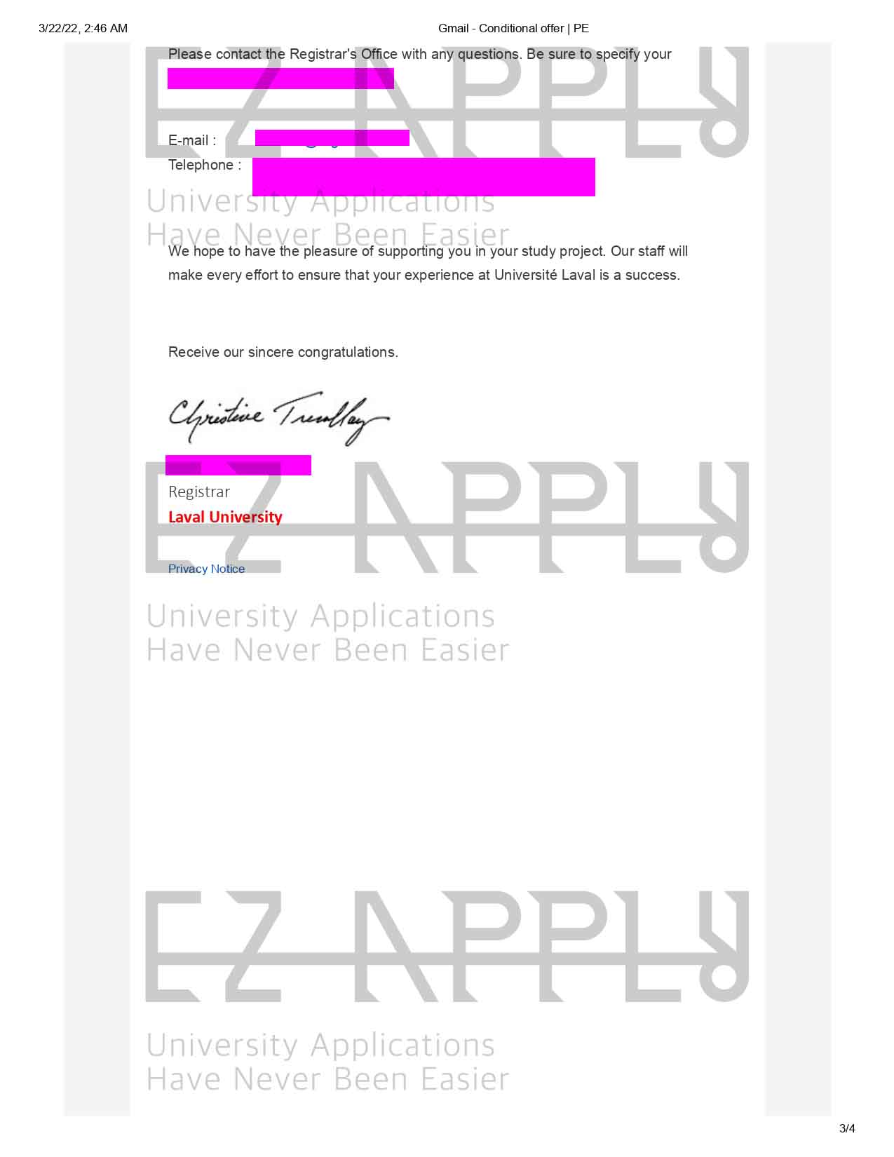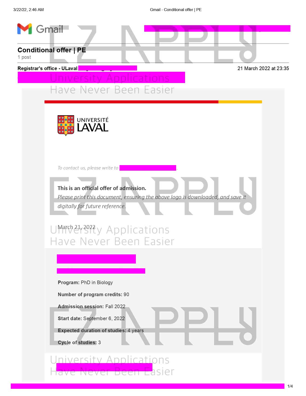 - اخذ پذیرش با فاند توسط تیم «ایزی اپلای» در مقطع دکتری در رشته «زیست شناسی» از «Laval University» در کانادا برای ترم پاییز 2022