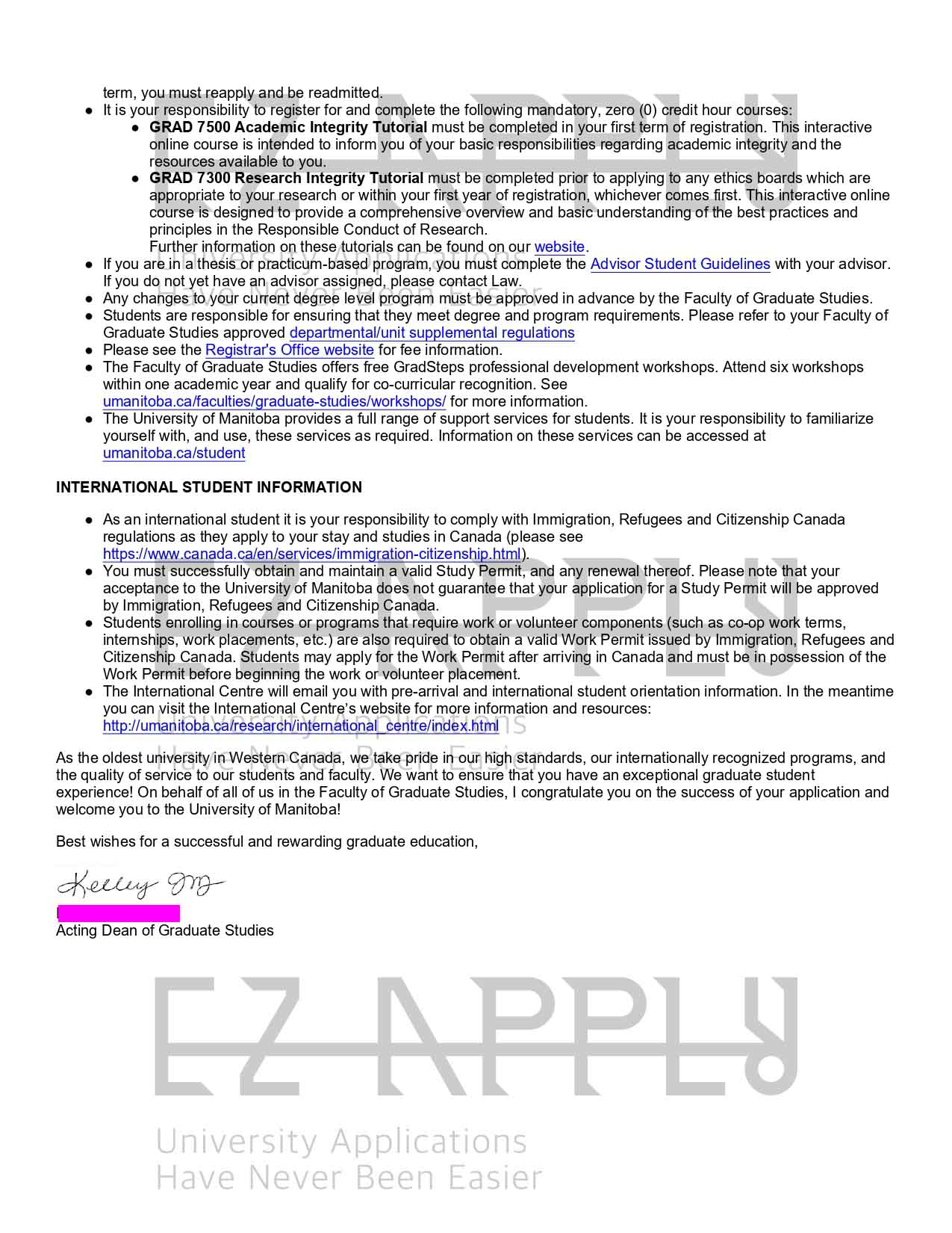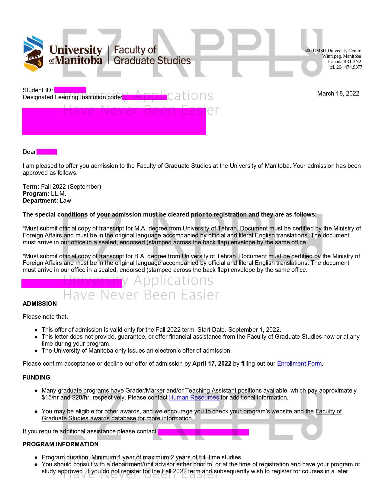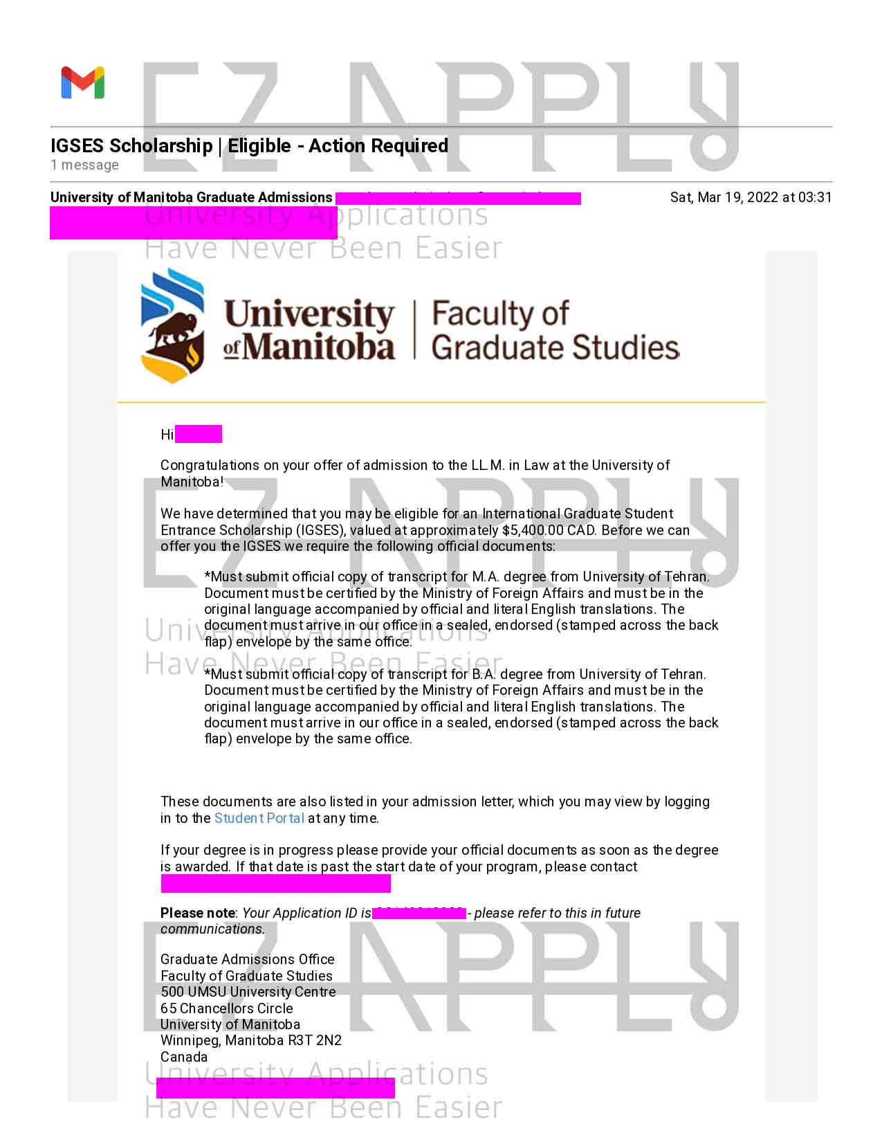 - اخذ پذیرش با فاند توسط تیم «ایزی اپلای» در مقطع کارشناسی ارشد در رشته «حقوق» از «University of Manitoba