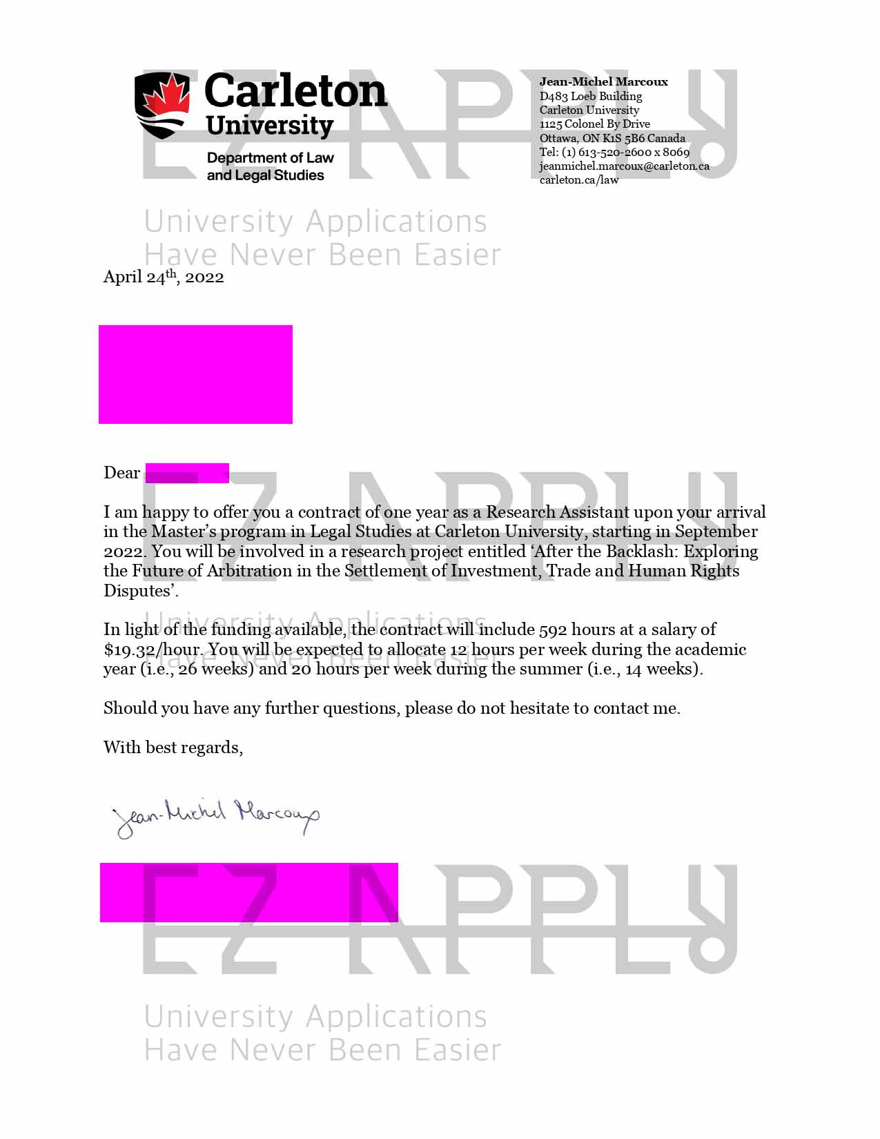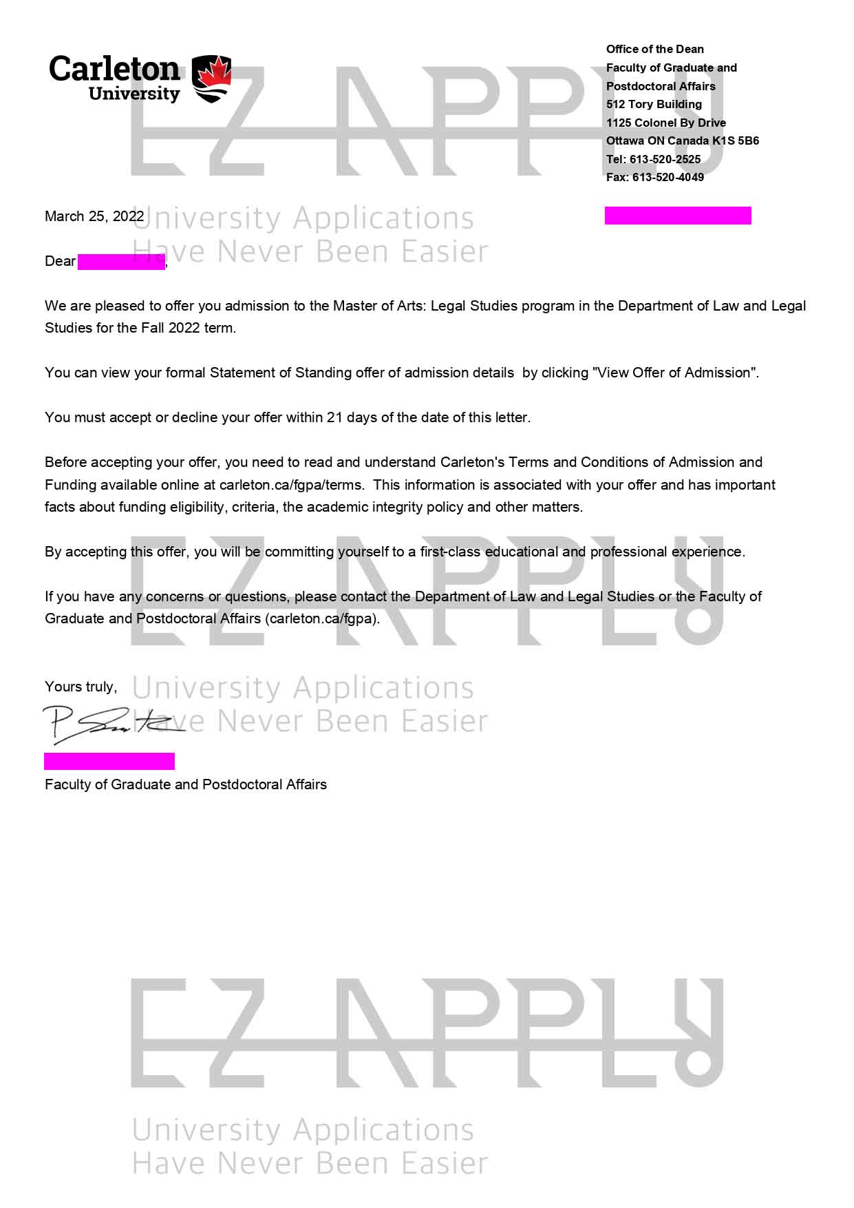 - اخذ پذیرش با فاند توسط تیم «ایزی اپلای» در مقطع کارشناسی ارشد در رشته «مطالعات حقوق» از «Carleton University» در کانادا برای ترم پاییز 2022