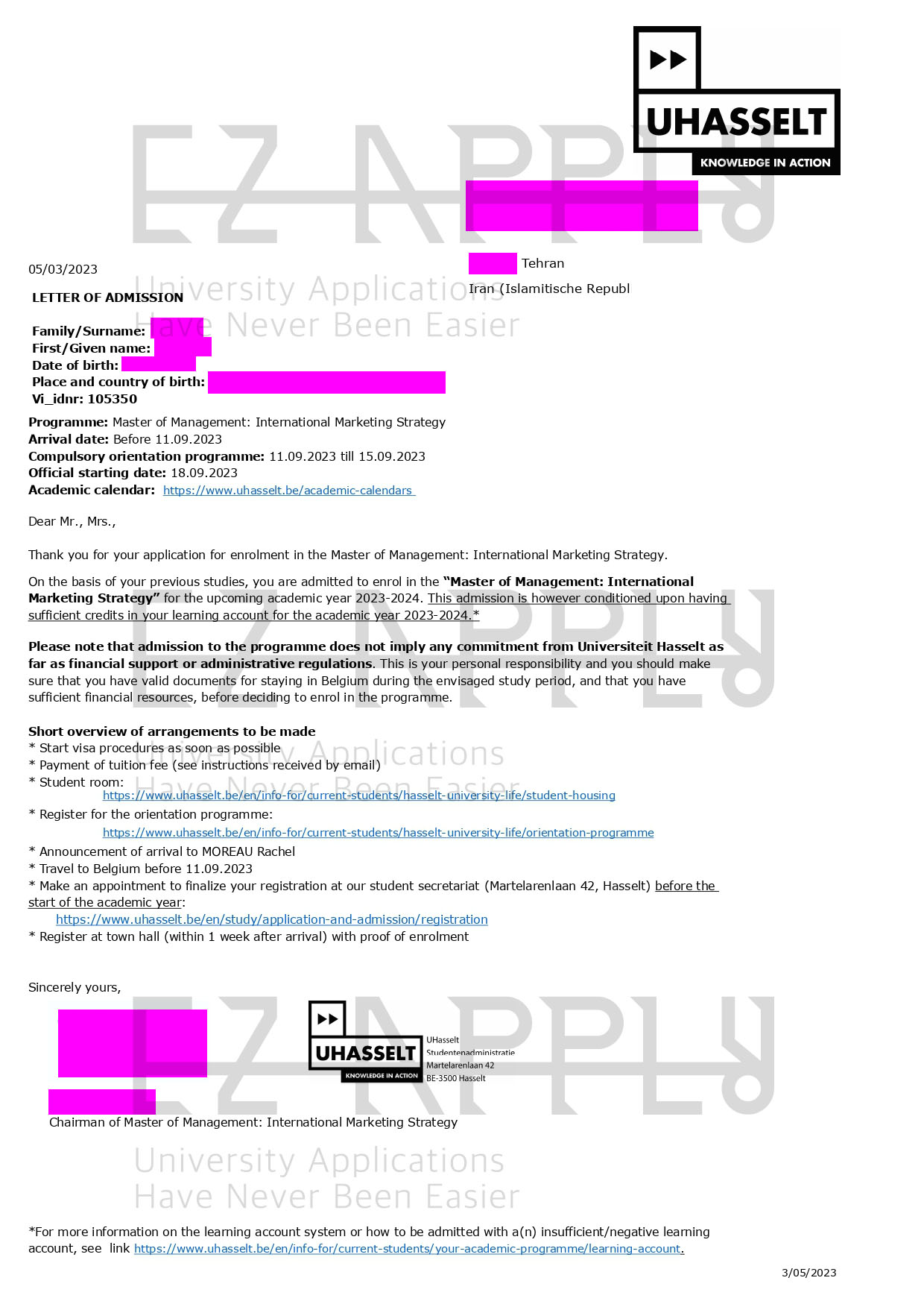اخذ پذیرش توسط تیم «ایزی اپلای» در مقطع «کارشناسی ارشد» در رشته ی « مدیریت،استراتژی بازاریابی بین المللی» از دانشگاه «Hasselt University» در بلژیک برای ترم پاییز 2023