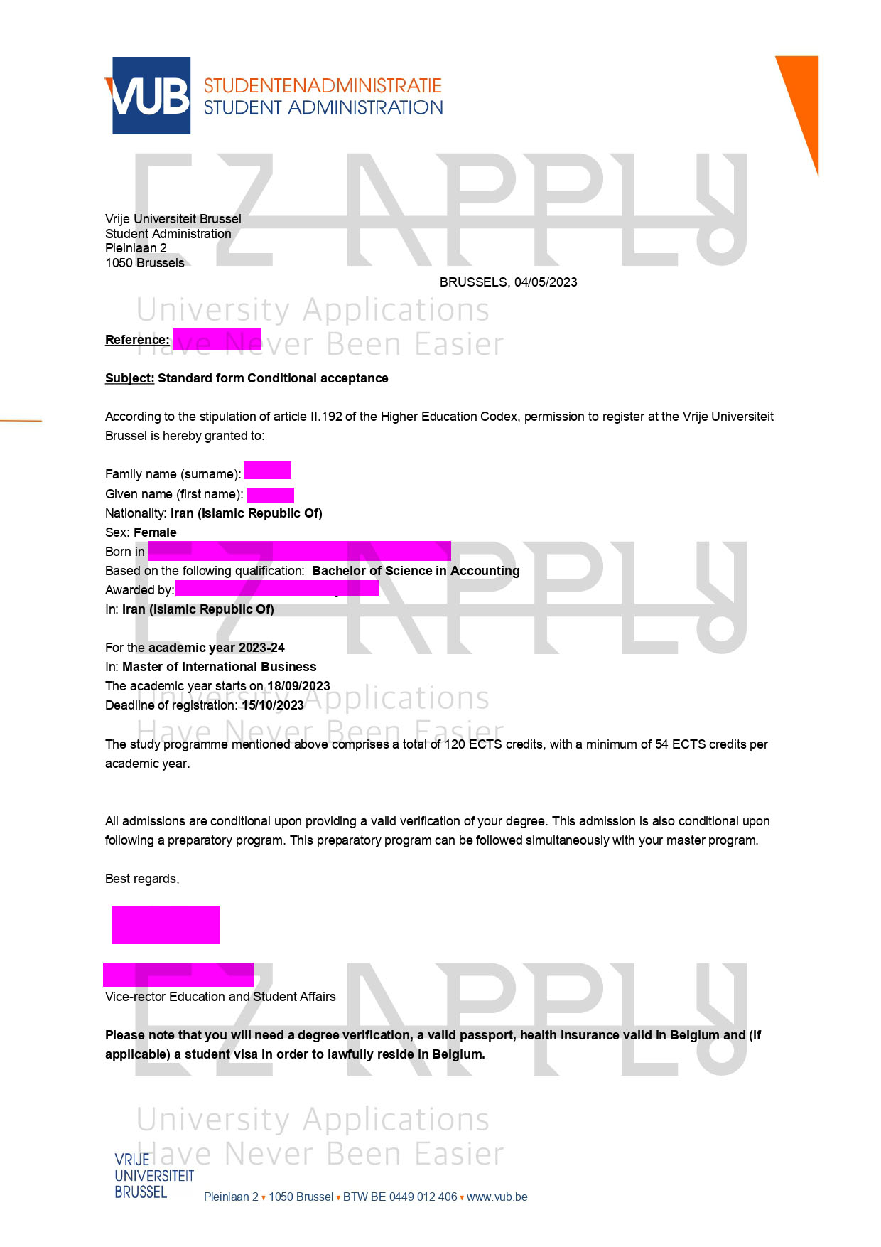 اخذ پذیرش توسط تیم «ایزی اپلای» در مقطع «کارشناسی ارشد» در رشته ی « تجارت بین الملل» از دانشگاه «Vrije Universiteit Brussel(VUB)» در بلژیک برای ترم پاییز 2023