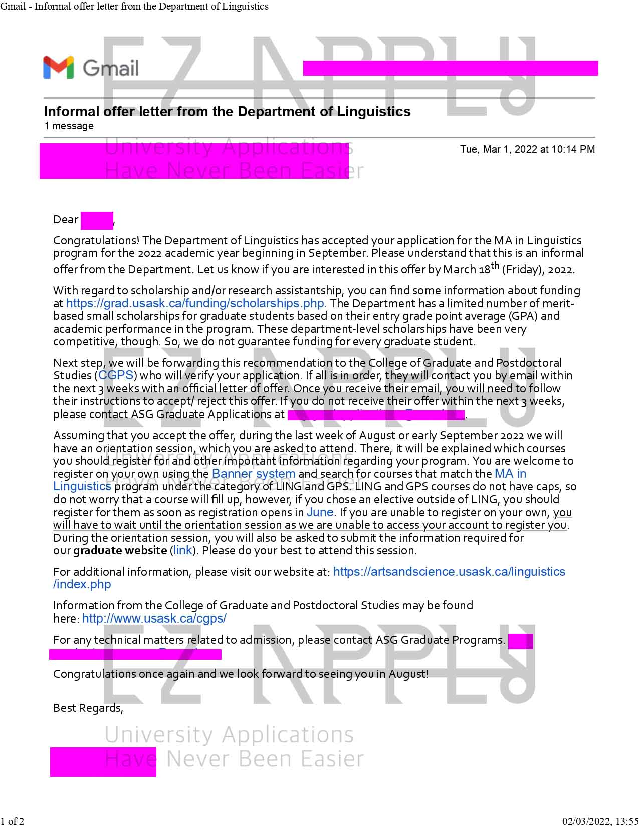- اخذ پذیرش توسط تیم «ایزی اپلای» در مقطع کارشناسی ارشد در رشته «زبان شناسی» از «University of Saskatchewan» در کانادا برای ترم پاییز 2022