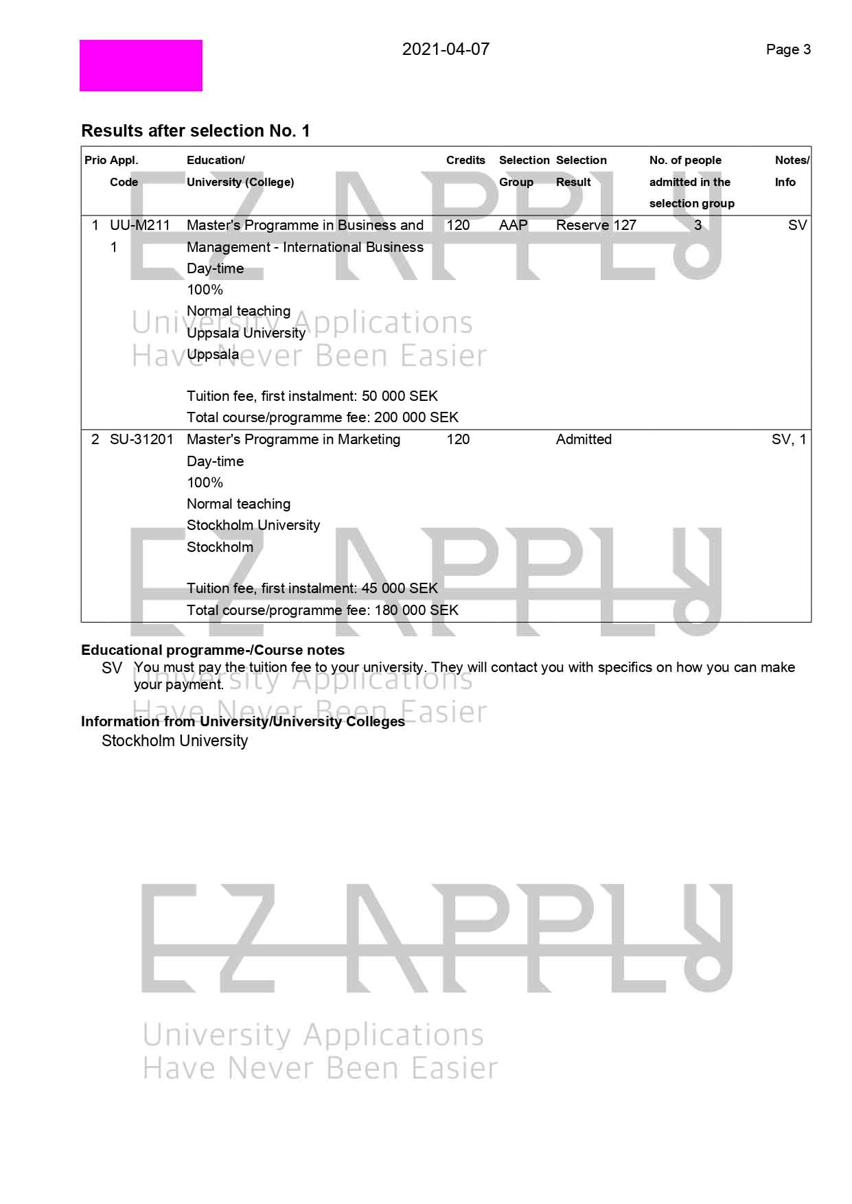 • اخذ پذیرش توسط تیم «ایزی اپلای» در مقطع کارشناسی ارشد در رشته «بازاریابی» از دانشگاه «Stockholm» درسوئد برای ترم پاییز 2021