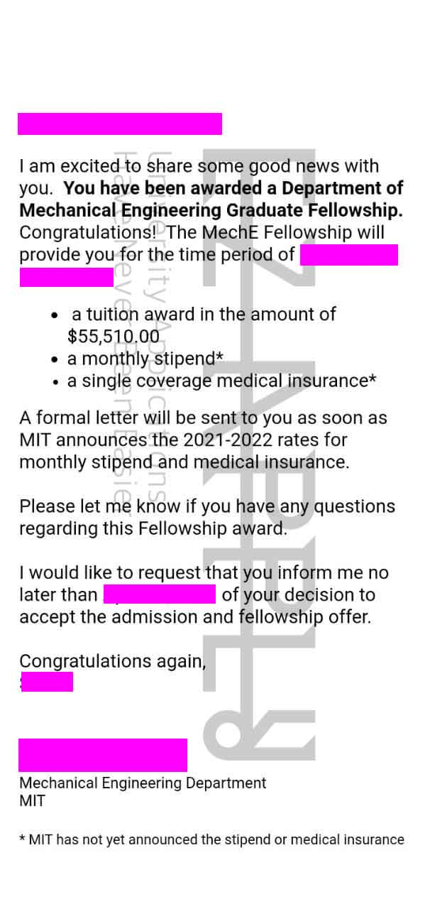 - اخذ پذیرش فول فاند توسط تیم «ایزی اپلای» در مقطع کارشناسی ارشد در رشته «مهندسی مکانیک» از «MIT» در آمریکا برای ترم پاییز