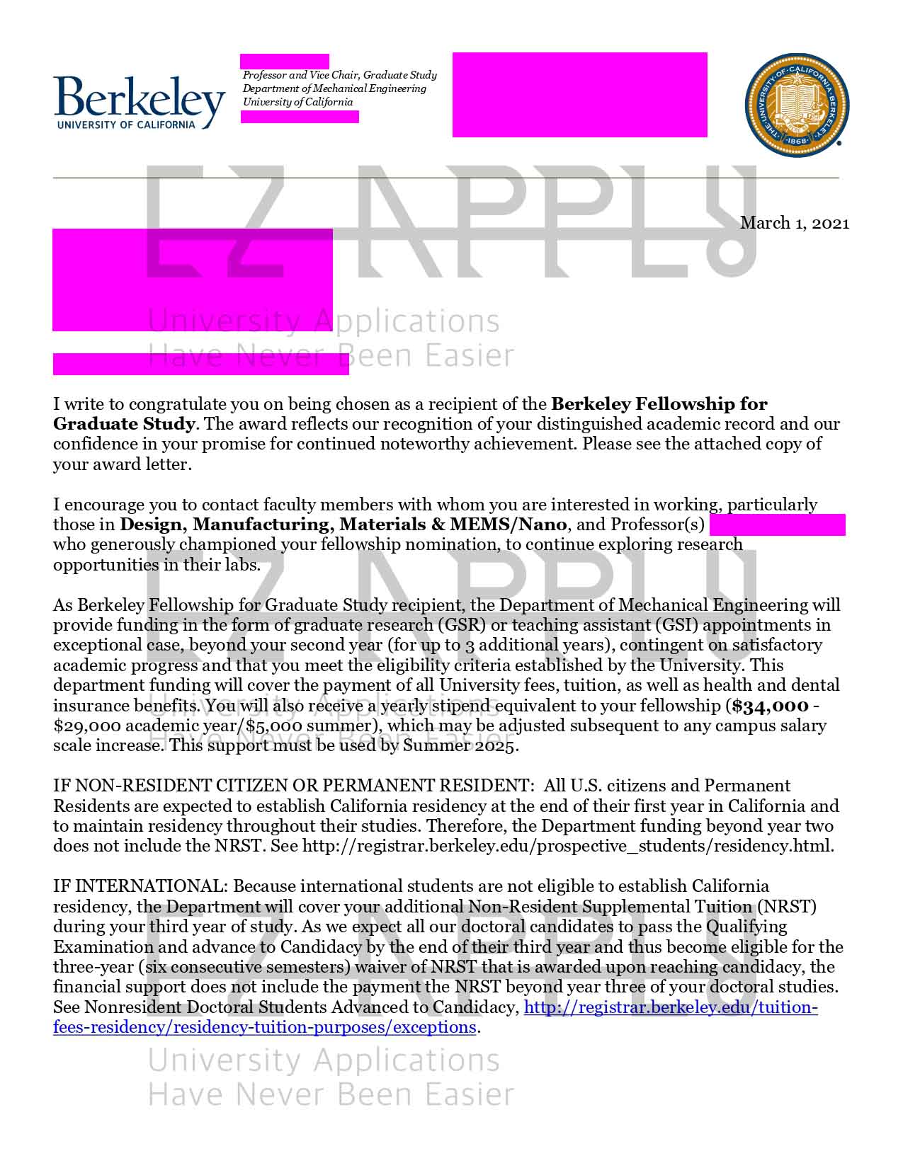 - اخذ پذیرش فول فاند توسط تیم «ایزی اپلای» در مقطع دکتری در رشته «مهندسی مکانیک» از «UCB» در آمریکا برای ترم پاییز 2021