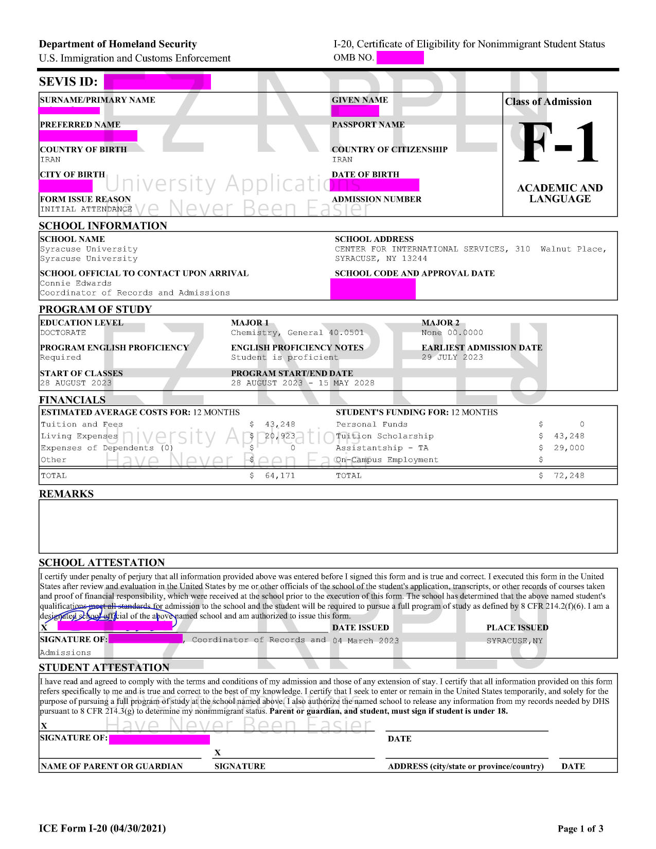 اخذ پذیرش فول فاند توسط تیم «ایزی اپلای» در مقطع «دکتری» در رشته ی «شیمی» از دانشگاه «Syracuse University» در آمریکا برای ترم پاییز 2023