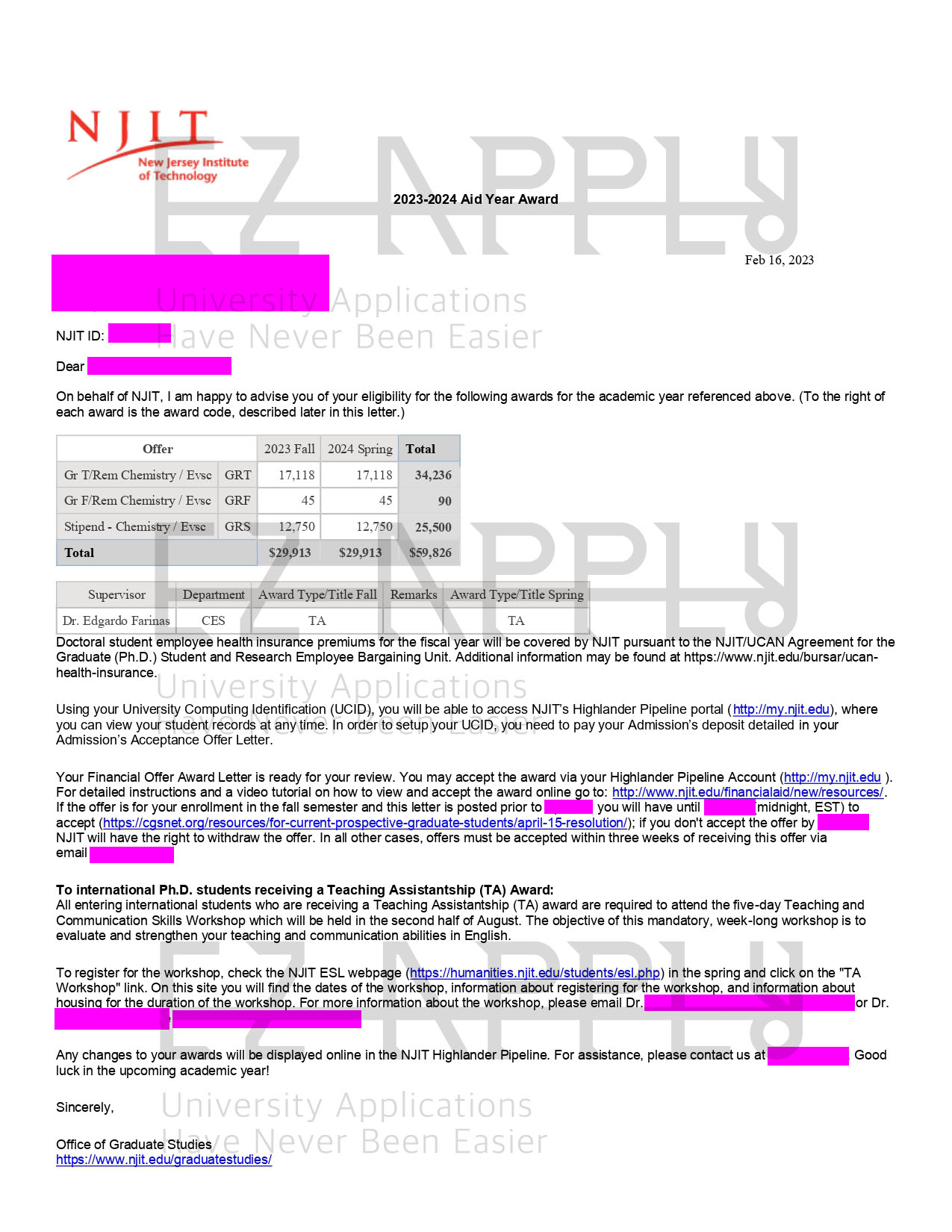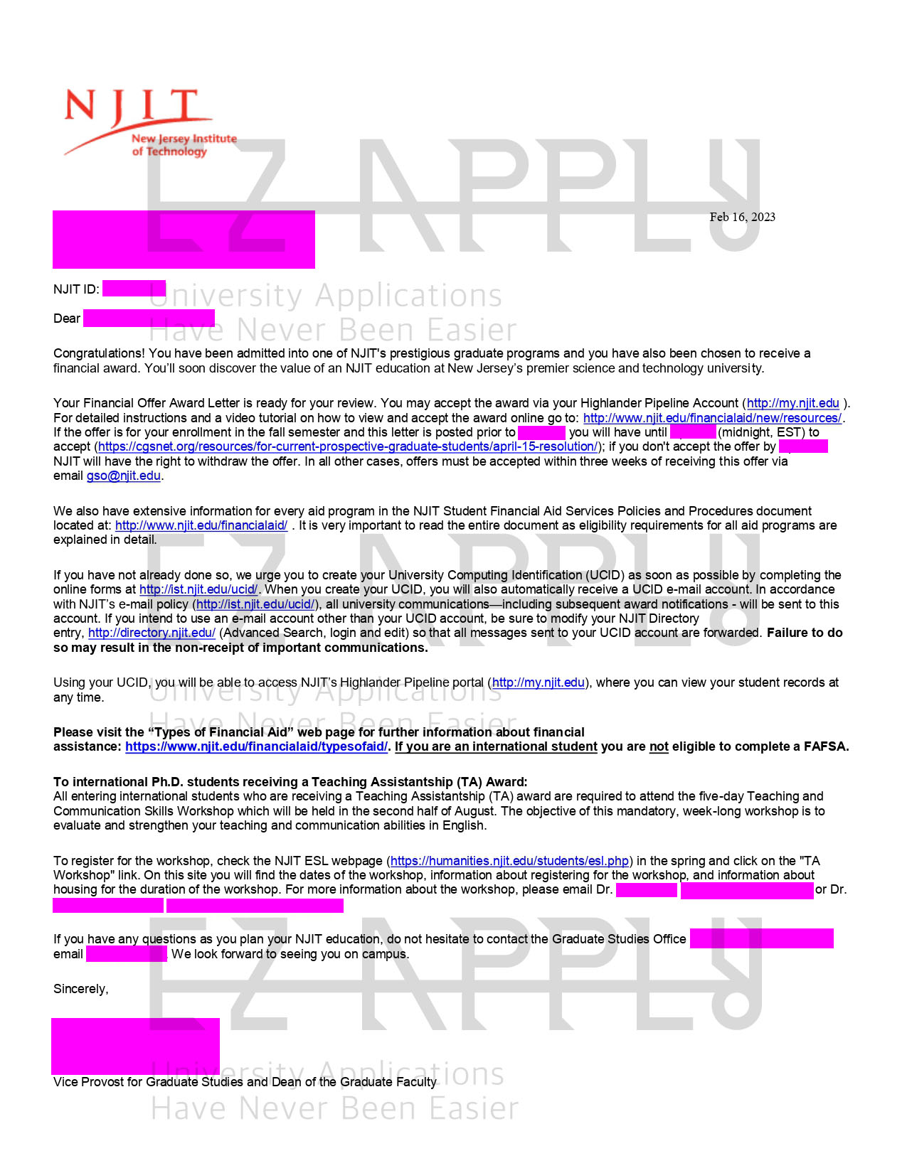 اخذ پذیرش فول فاند توسط تیم «ایزی اپلای» در مقطع «دکتری» در رشته ی «شیمی» از دانشگاه «New Jersey Institute of Technology» در آمریکا برای ترم پاییز 2023