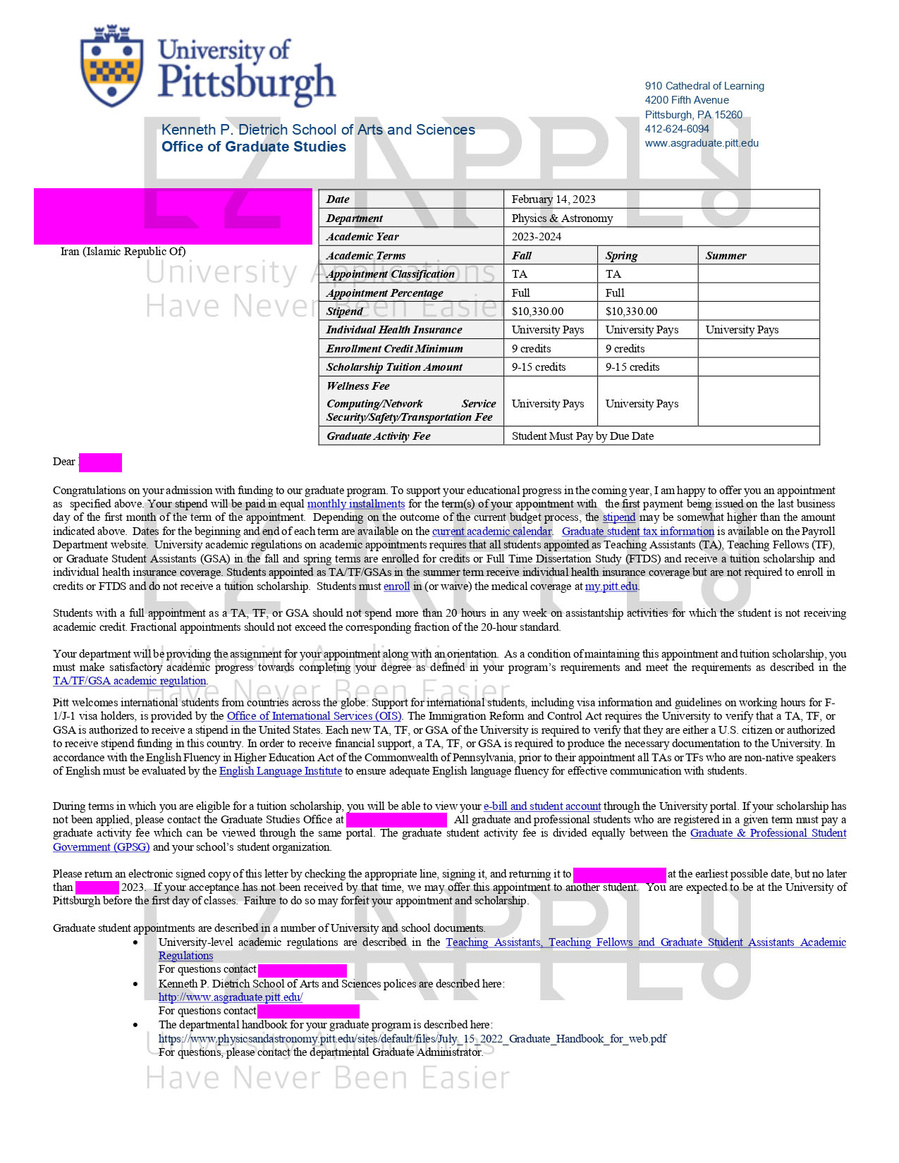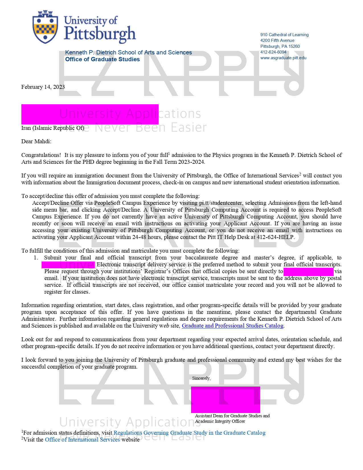 اخذ پذیرش فول فاند توسط تیم «ایزی اپلای» در مقطع «دکتری» در رشته ی «فیزیک و ستاره شناسی» از دانشگاه «University of Pittsburgh» در آمریکا برای ترم پاییز 2023