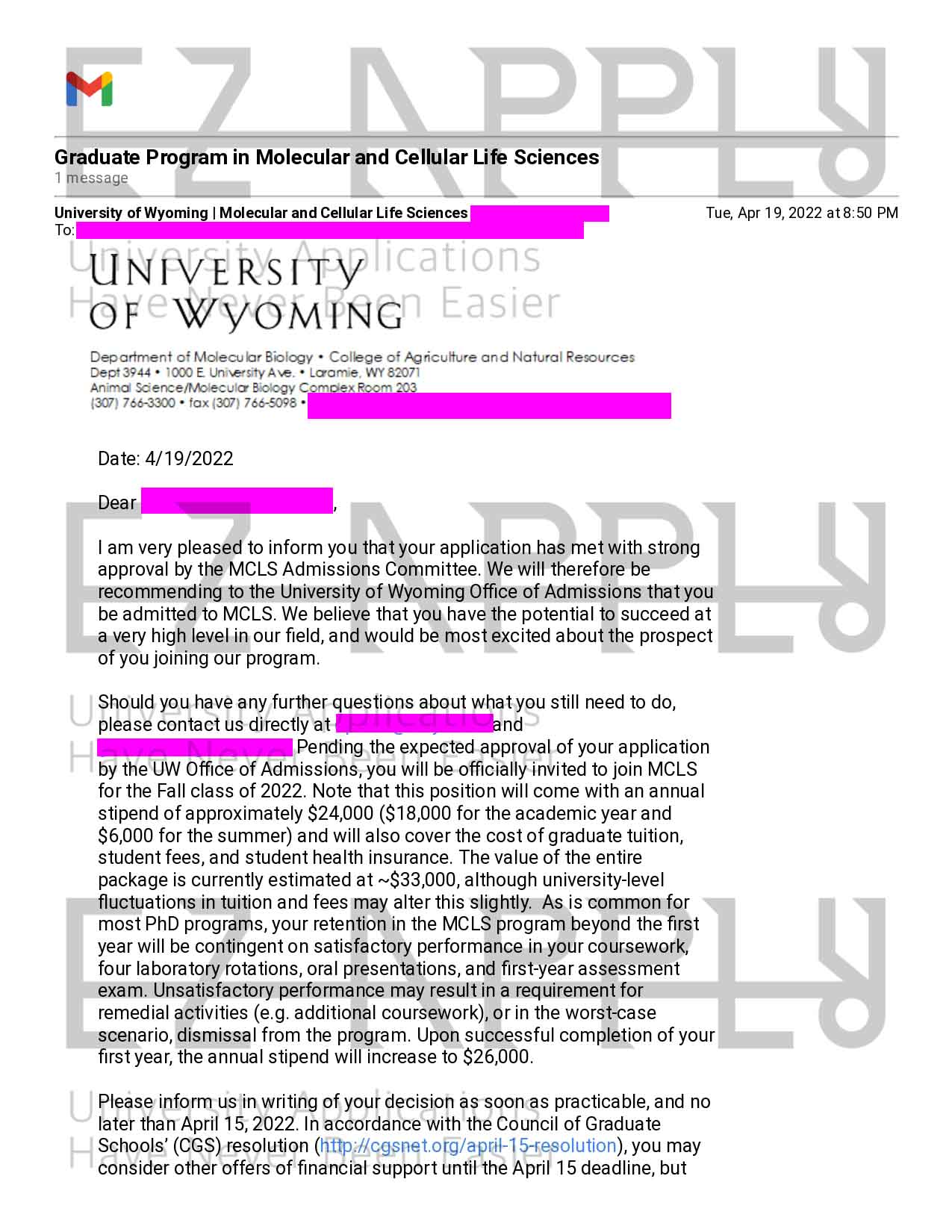 اخذ پذیرش فول فاند توسط تیم «ایزی اپلای» در مقطع دکتری در رشته «Molecular and Cellular Life Sciences» از «University of Wyoming» در آمريكا براي پاییز 2022