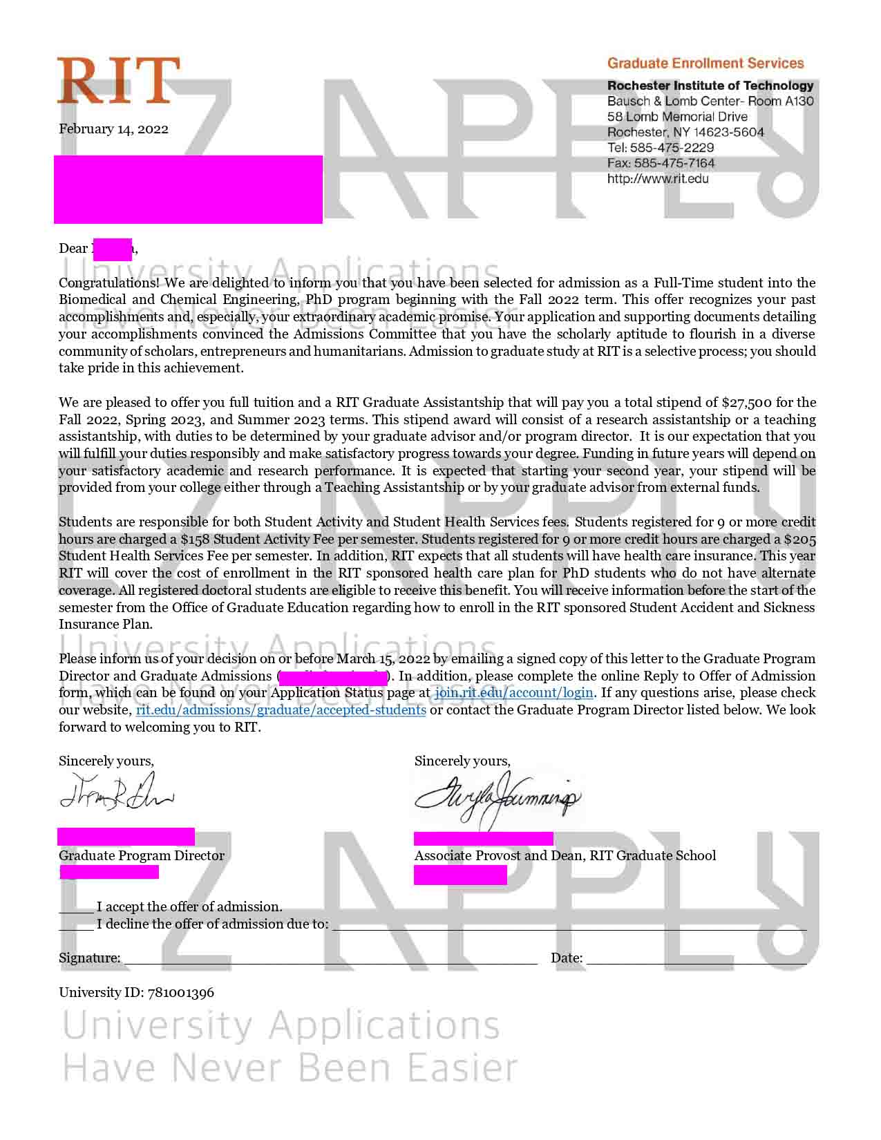 اخذ پذیرش فول فاند توسط تیم «ایزی اپلای» در مقطع دکتری در رشته «Biomedical and Chemical Engineering» از «Rochester Tech» در آمریکا برای پاییز 2022