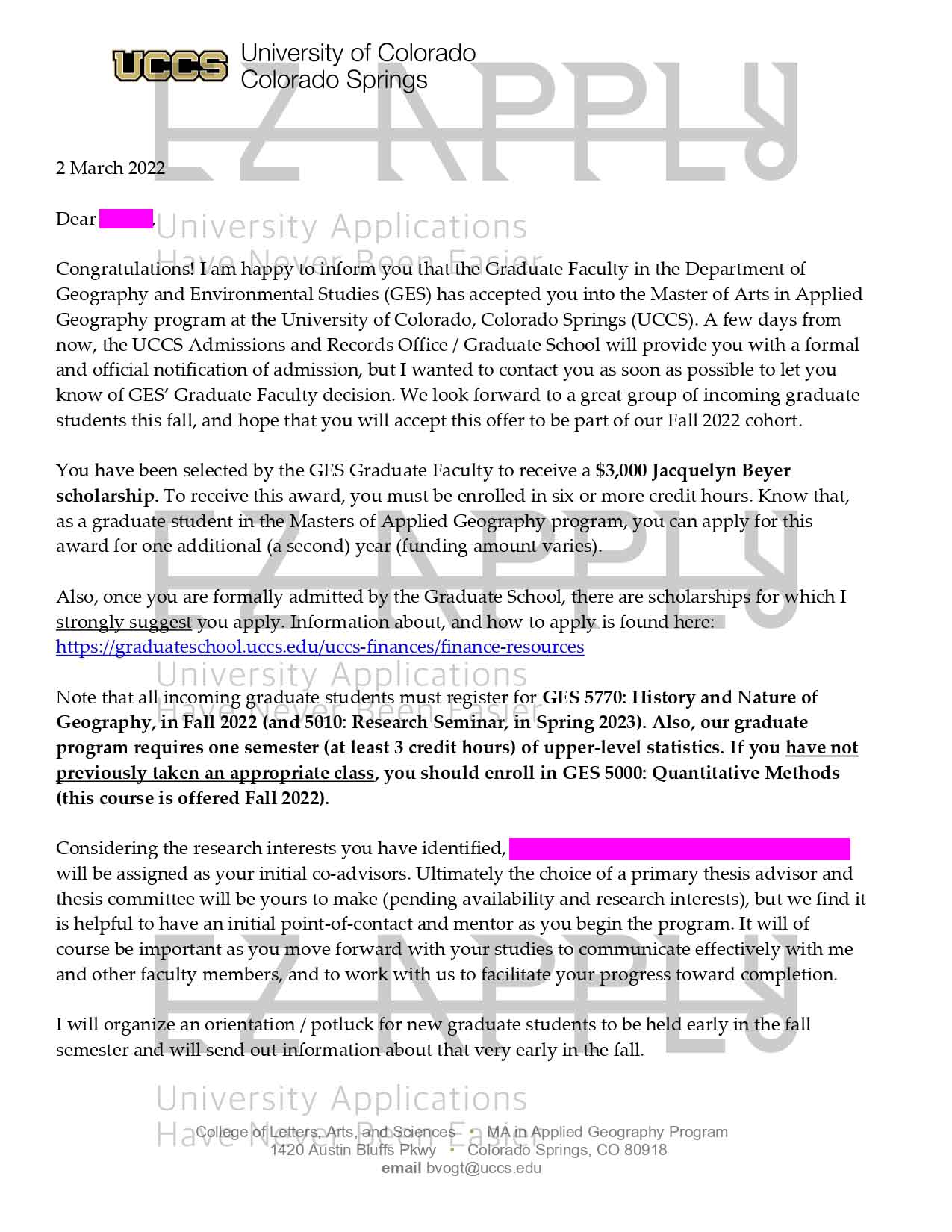 - اخذ پذیرش با فاند توسط تیم «ایزی اپلای» در مقطع کارشناسی ارشد در رشته «جغرافیا» از «University of Colorado Colorado Springs» در آمریکا برای ترم پاییز 2022