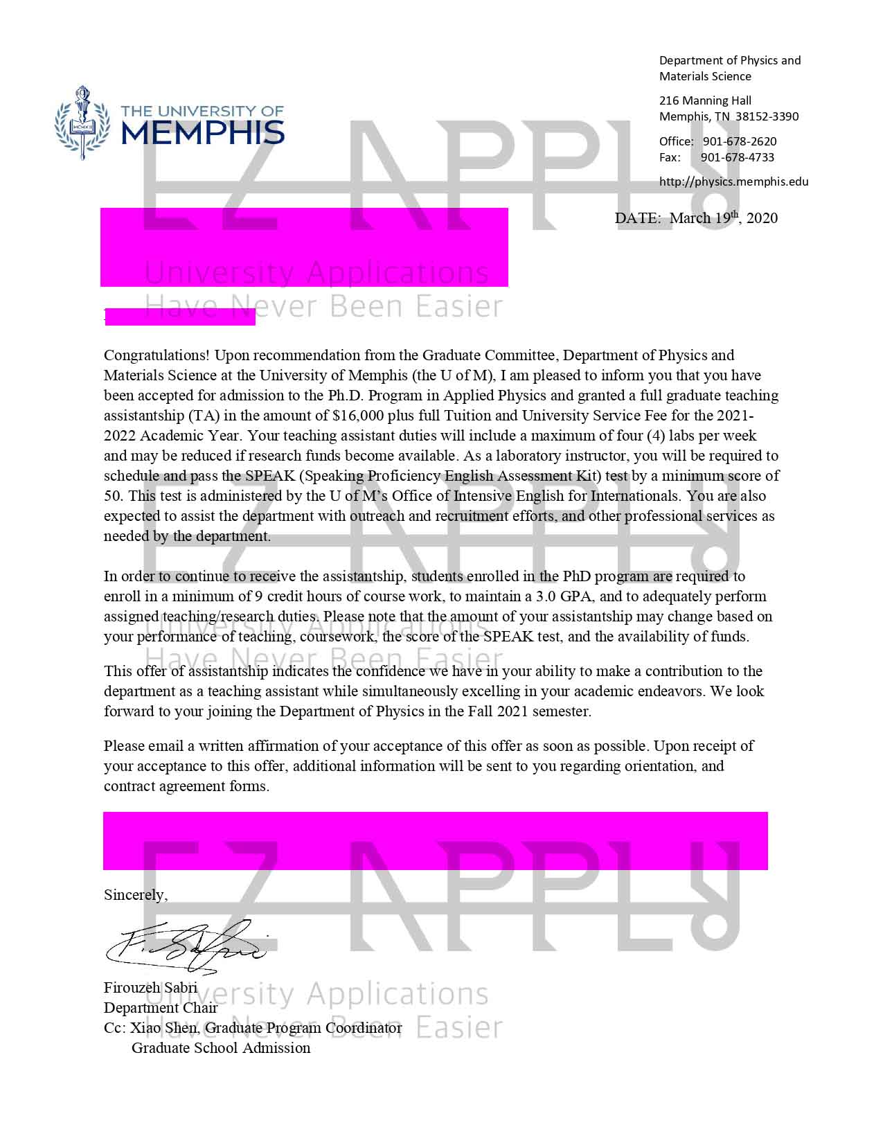 •  اخذ پذیرش فول فاند توسط تیم «ایزی اپلای» در مقطع دکتری در رشته «فیزیک» از دانشگاه «Memphis» در آمریکا برای ترم پاییز 2021