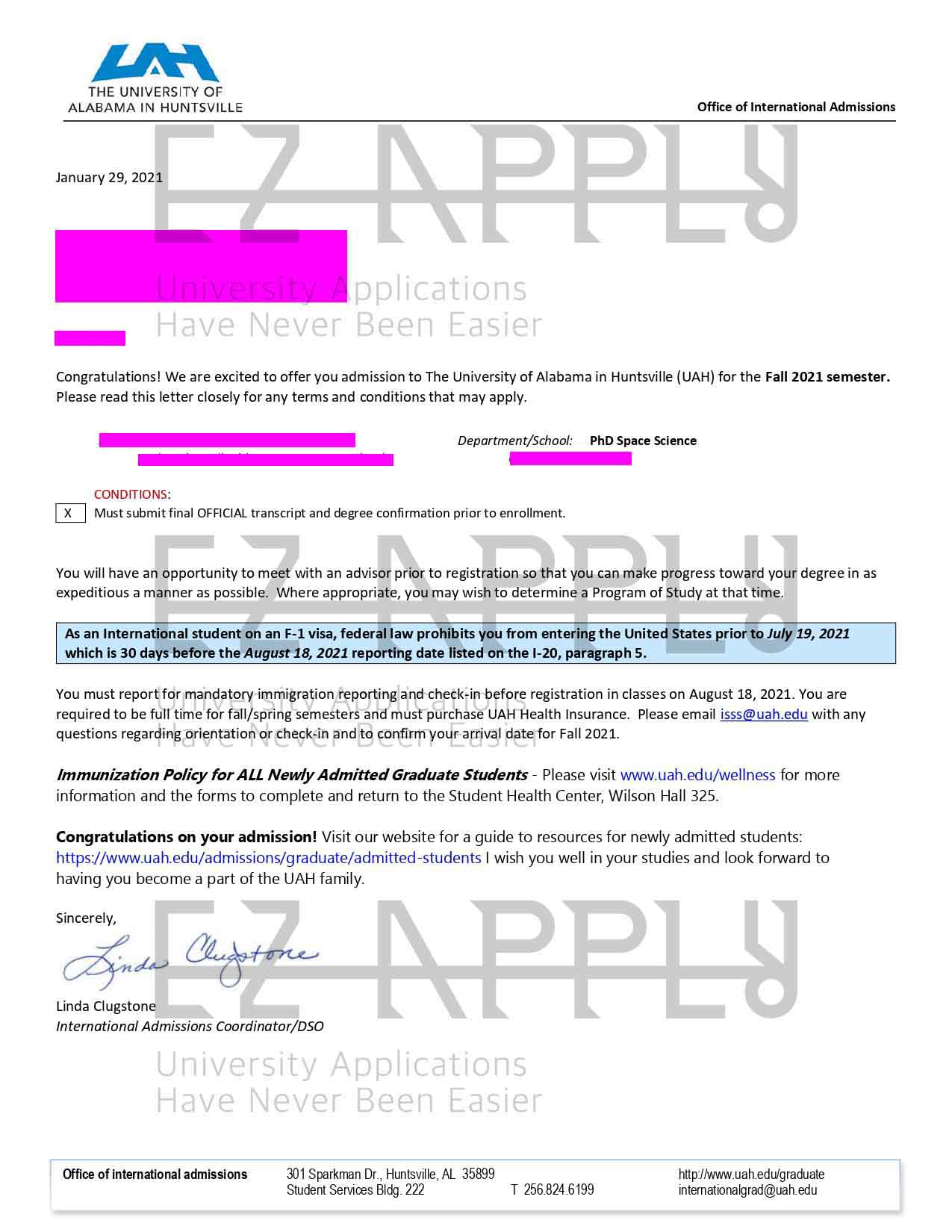 • اخذ پذیرش فول فاند توسط تیم «ایزی اپلای» در مقطع دکتری در رشته «فیزیک» از دانشگاه «Alabama» در آمریکا برای ترم پاییز 2021