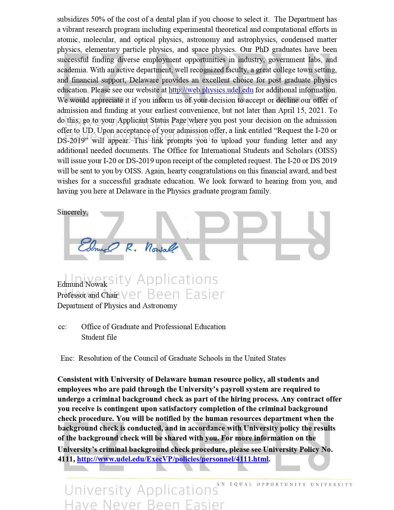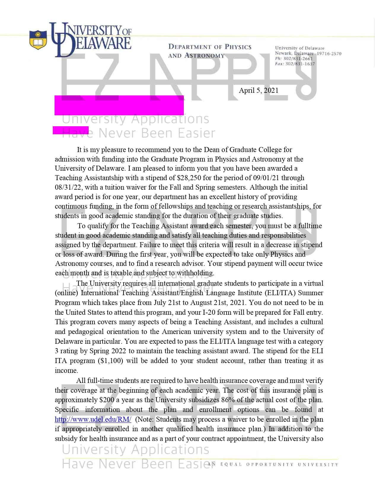 • اخذ پذیرش فول فاند توسط تیم «ایزی اپلای» در مقطع دکتری در رشته «فیزیک» از دانشگاه «Delaware» در آمریکا برای ترم پاییز 2021