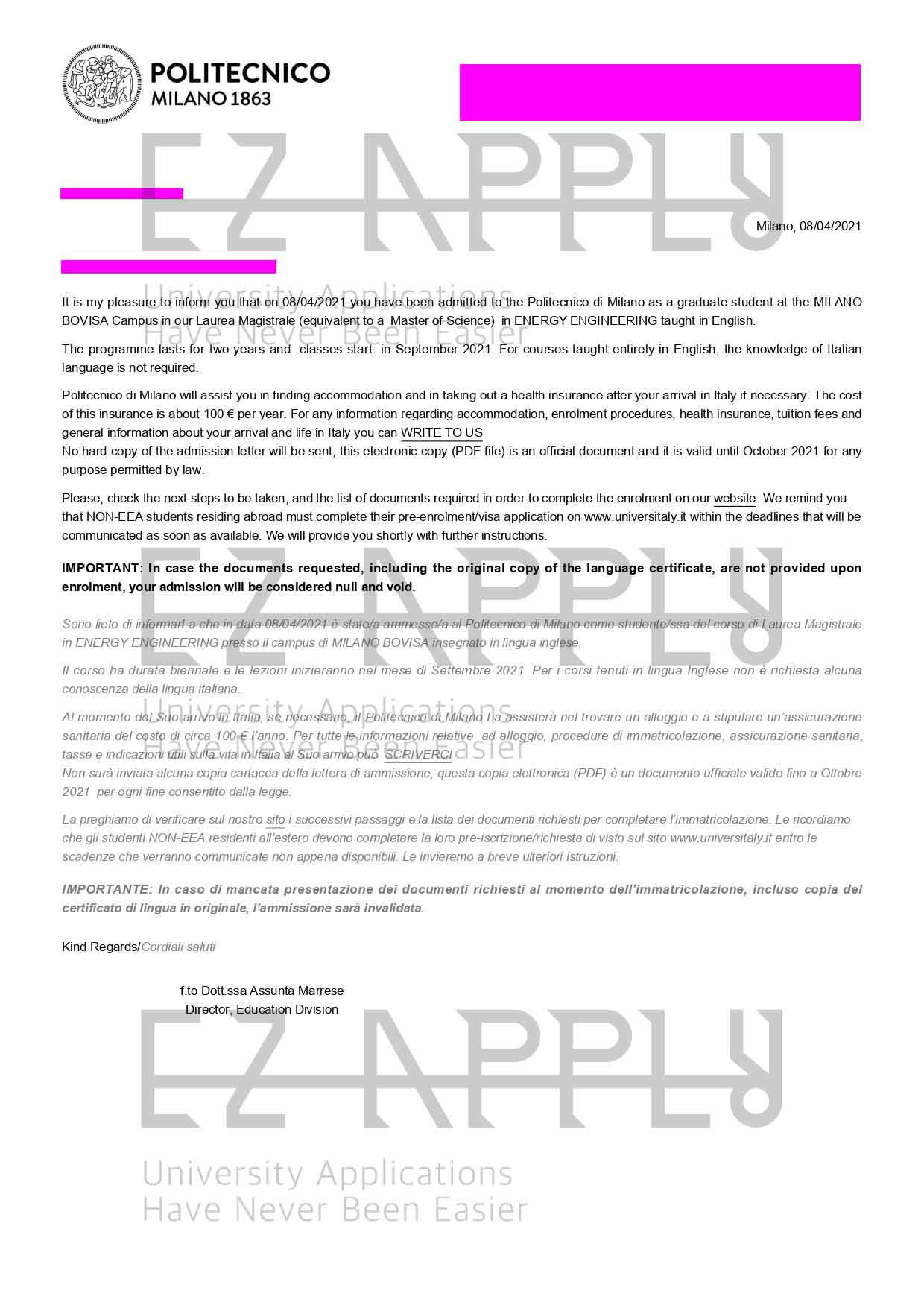 - اخذ پذیرش توسط تیم «ایزی اپلای» در مقطع کارشناسی ارشد در رشته «مهندسی انرژی» از دانشگاه «پلی تکنیک میلان» در ایتالیا برای ترم پاییز 2021