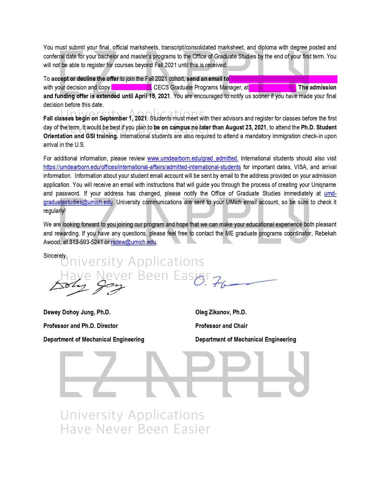 - اخذ پذیرش فول فاند توسط تیم «ایزی اپلای» در مقطع دکتری در رشته «مهندسی مکانیک» از دانشگاه «Michigan-Dearborn» در آمریکا برای ترم پاییز 2021