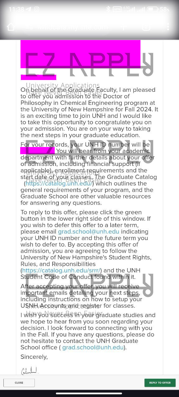ادمیشن اخذ شده در مقطع «دکتری» در رشته «Chemical Engineering» از University of New Hampshire در آمریکا برای پاییز 2024