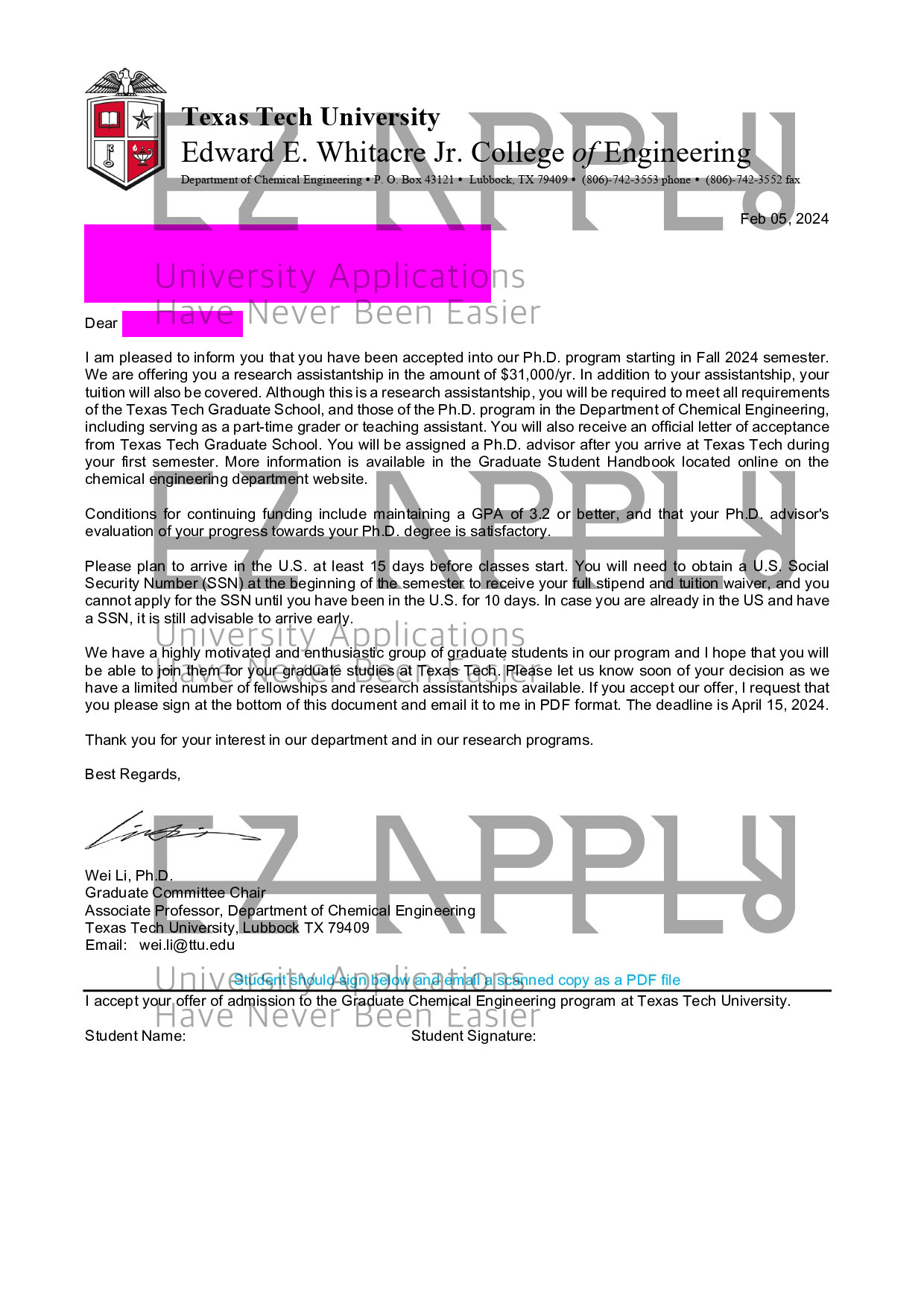 ادمیشن فول فاند اخذ شده در مقطع «دکتری» در رشته «Chemical Engineering» از Texas Tech University در آمریکا برای پاییز 2024