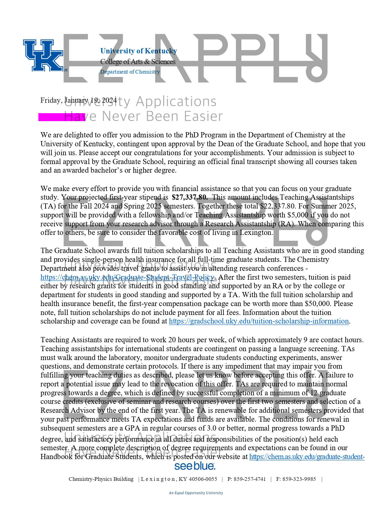 ادمیشن فول فاند اخذ شده در مقطع «دکتری» در رشته «Chemistry» از University of Kentucky در آمریکا برای پاییز 2024