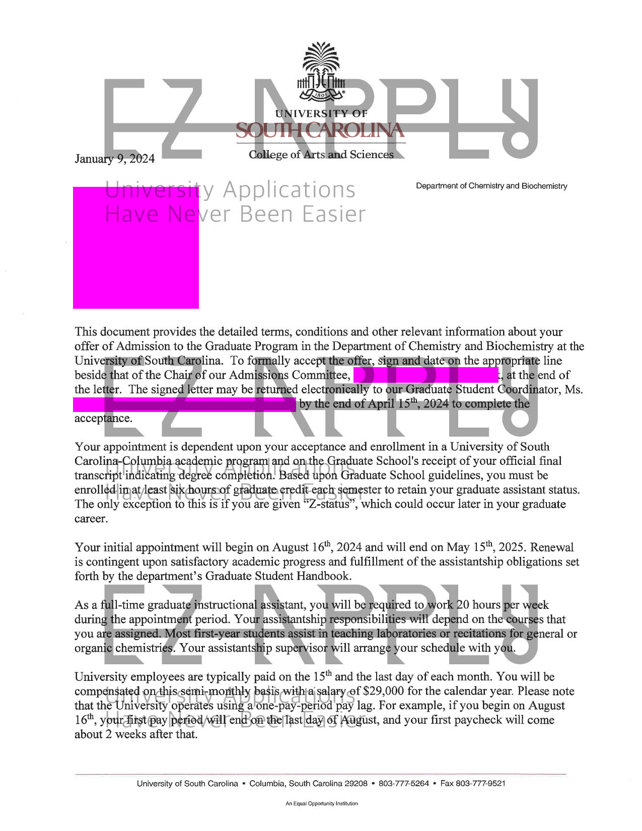 ادمیشن فول فاند اخذ شده در مقطع «دکتری» در رشته «Chemistry» از University of South Carolina در آمریکا برای پاییز 2024