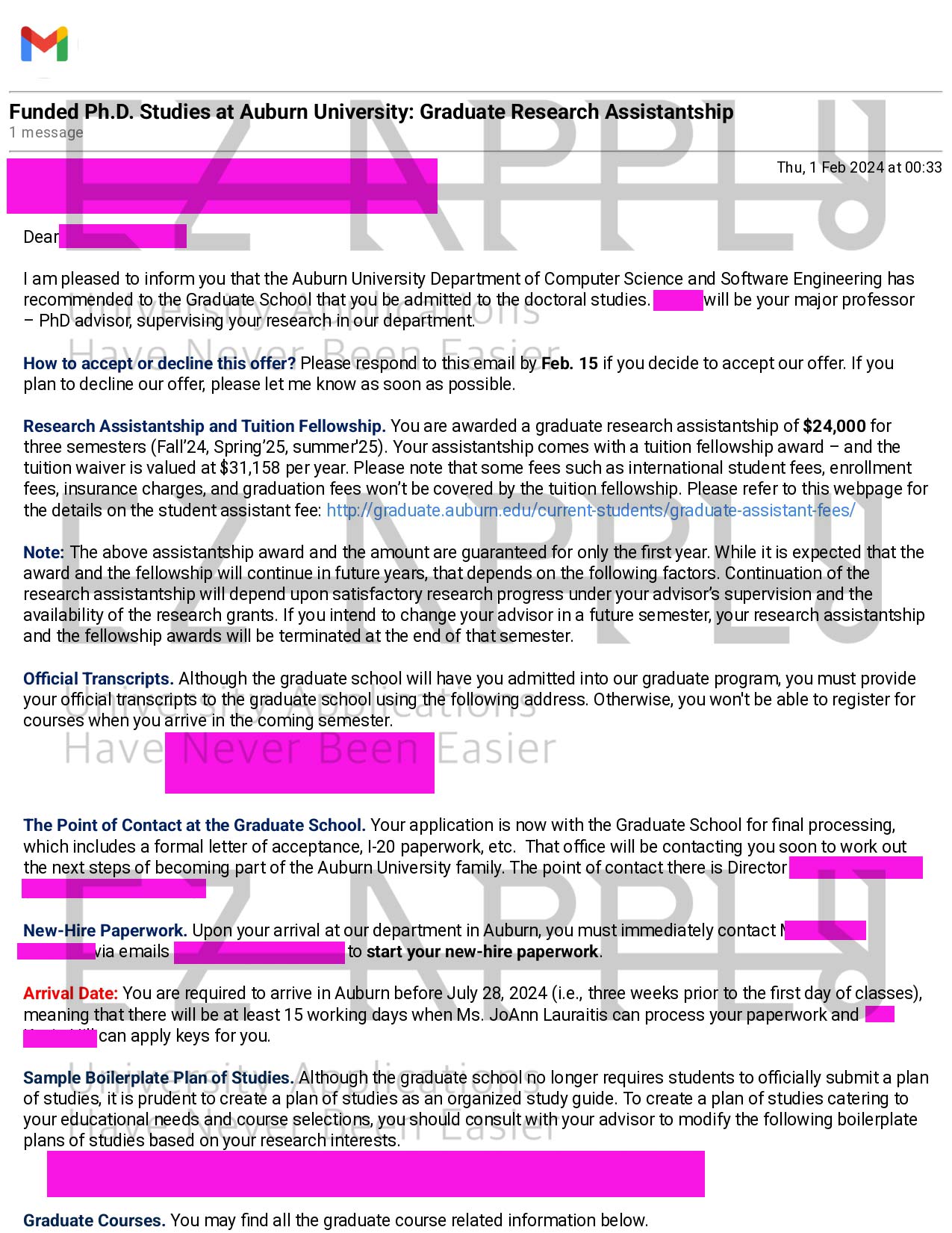 ادمیشن فول فاند اخذ شده توسط تیم ایزی اپلای در مقطع «دکتری» در رشته «Computer Science and Software Engineering» از «Auburn University» در آمریکا برای پاییز 2024