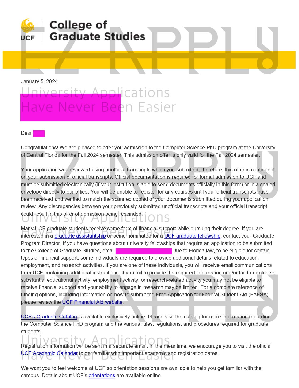 ادمیشن اخذ شده توسط تیم ایزی اپلای در مقطع «دکتری» در رشته «Computer Science» از «University of Central Florida» در آمریکا برای پاییز 2024