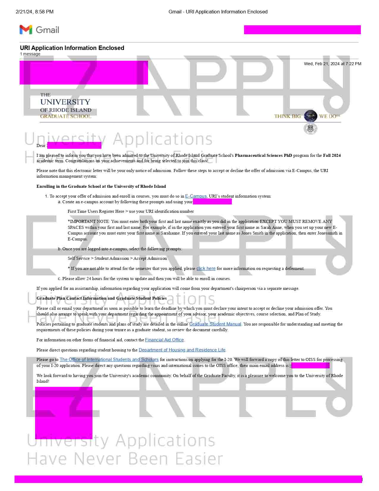 ادمیـشن اخذ شده توسط تیم ایزی اپلای در مقطع «دکتری» در رشته «Pharmaceutical Sciences» از University of Rhode Island