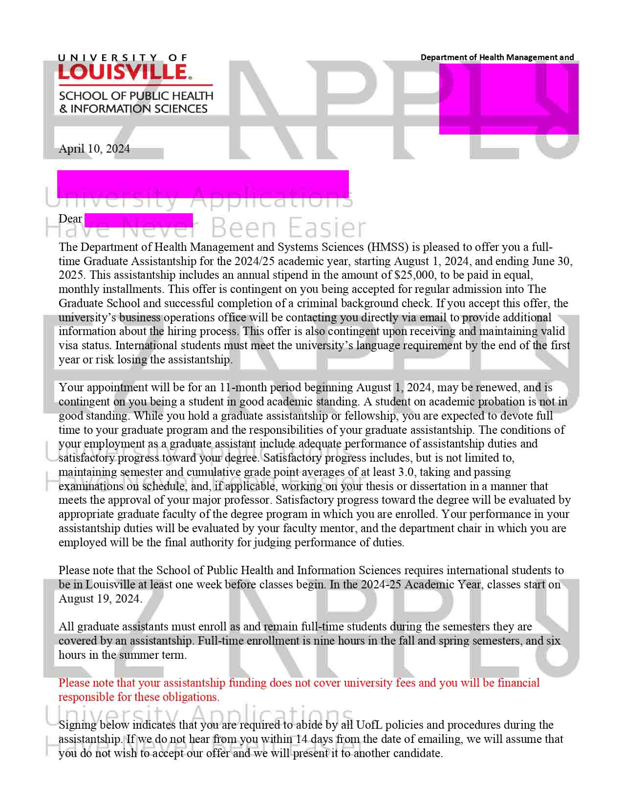 ادمیـشن فول فاند اخذ شده توسط تیم ایزی اپلای در مقطع «دکتری» در رشته «Health Management and Systems Sciences» از University of Louisville برای پاییز 2024 از آمریکا
