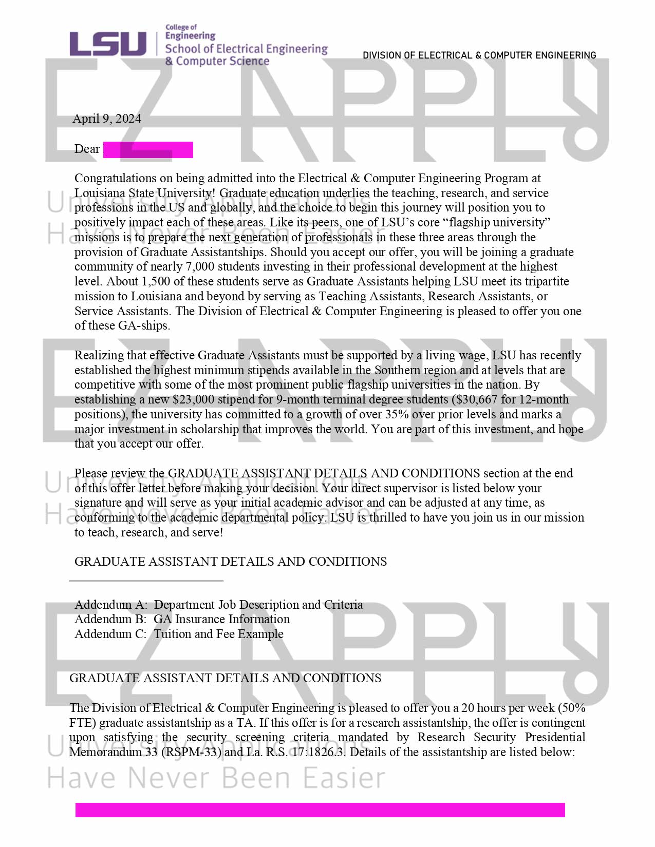ادمیـشن فول فاند اخذ شده توسط تیم ایزی اپلای در مقطع «دکتری» در رشته «Electrical Engineering» از Louisiana State University در آمریکا برای پاییز 2024