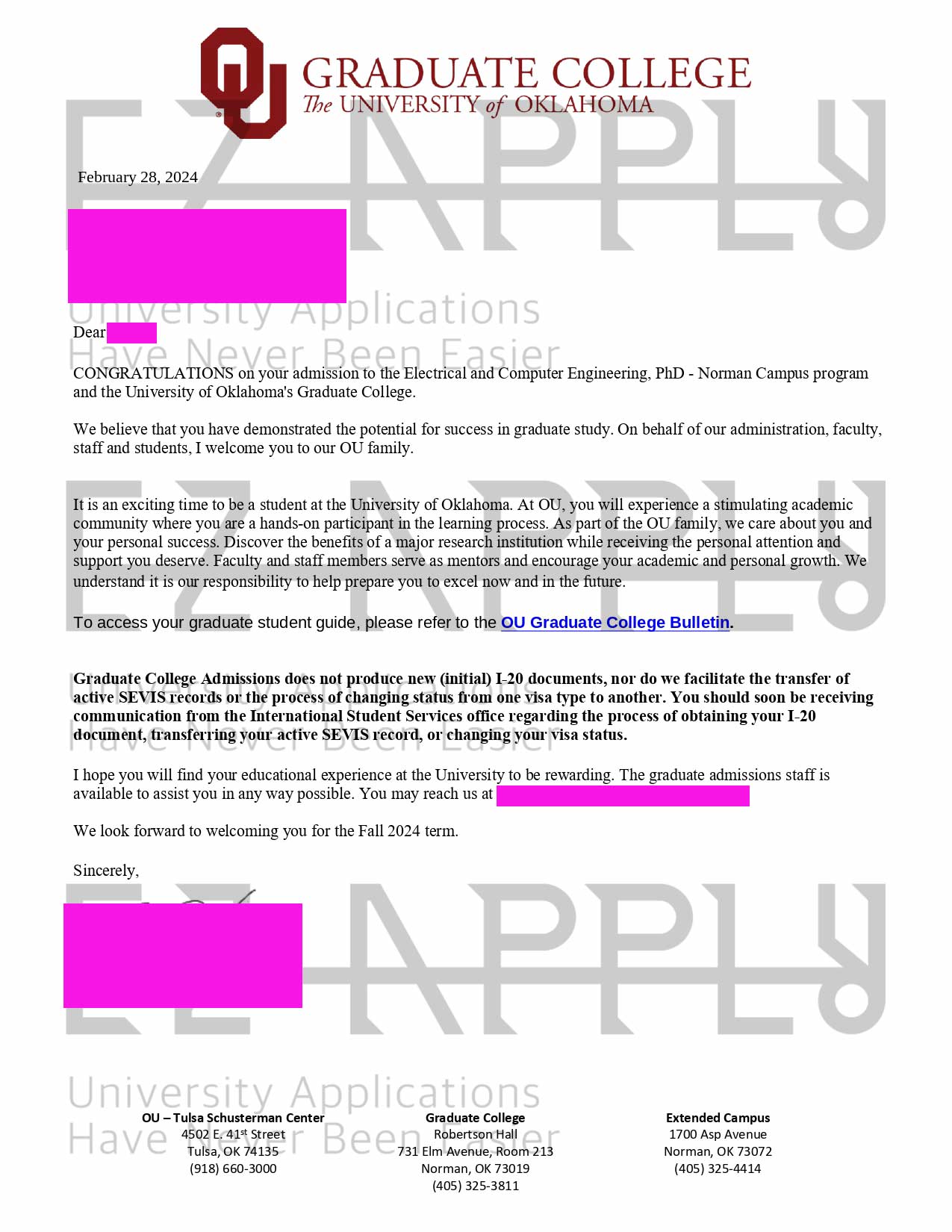 ادمیـشن اخذ شده توسط تیم ایزی اپلای در مقطع «دکتری» در رشته «Electrical Engineering» از University of Oklahoma در آمریکا برای پاییز 2024
