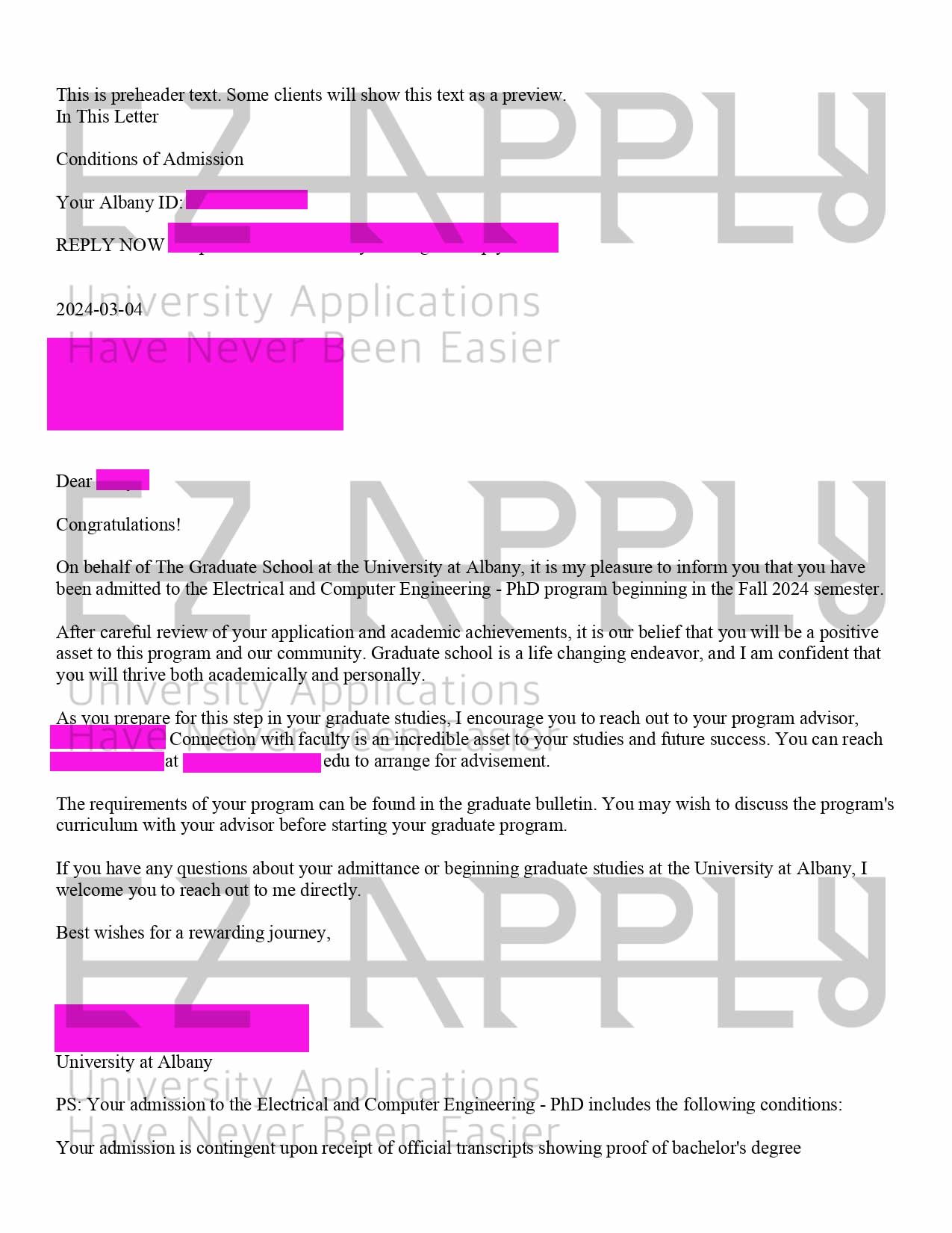 ادمیـشن اخذ شده توسط تیم ایزی اپلای در مقطع «دکتری» در رشته «Electrical and Computer Engineering» از University at Albany در آمریکا برای پاییز 2024