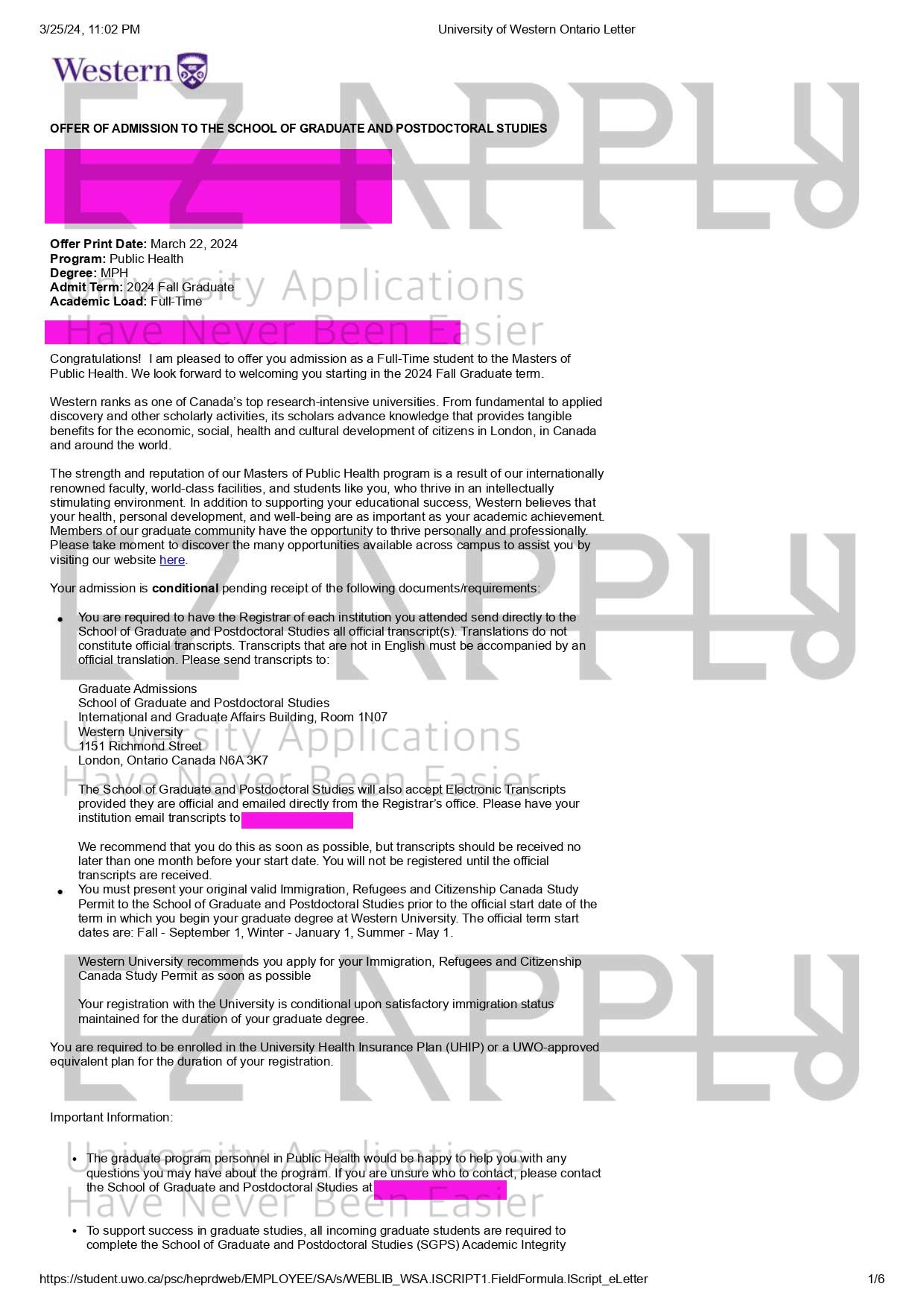 ادمیـشن اخذ شده توسط تیم ایزی اپلای در مقطع «کارشناسی ارشد» در رشته « Public Health» از University of Western از کانادا برای پاییز 2024