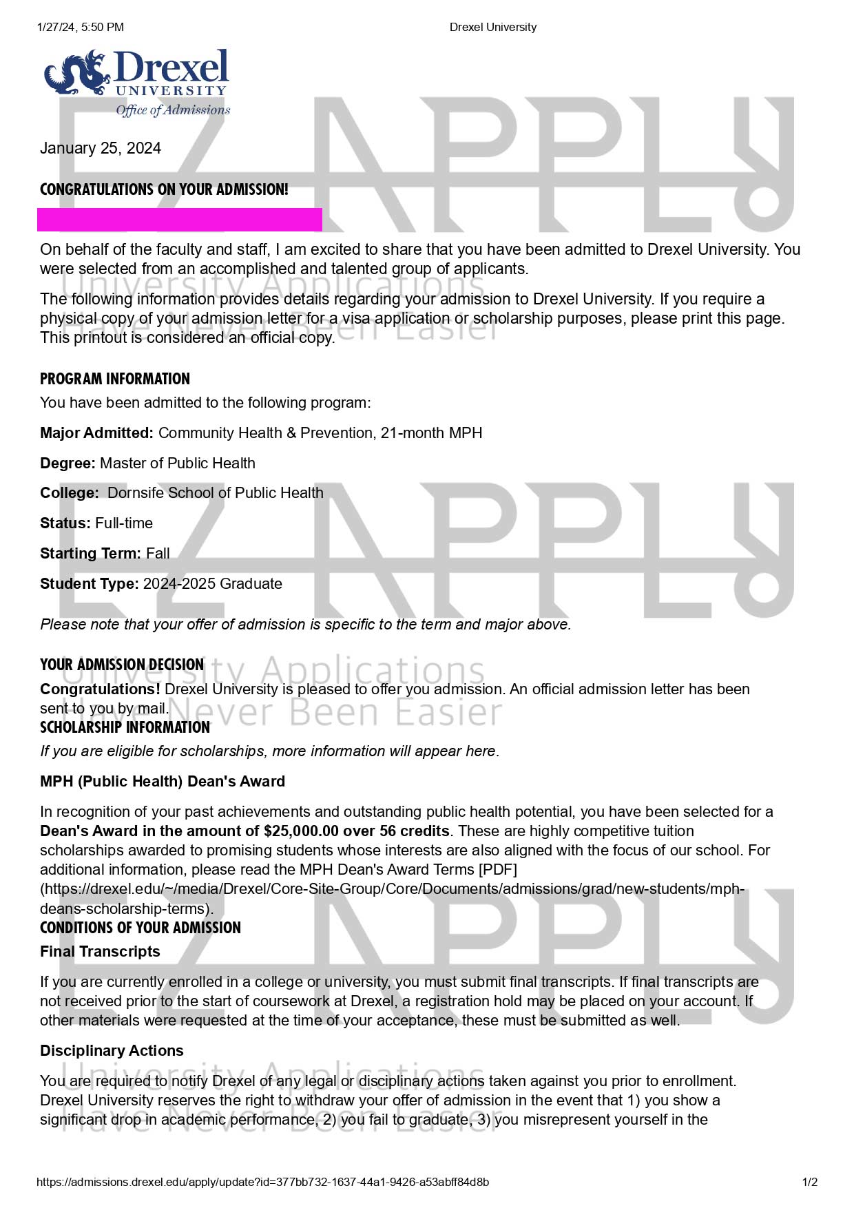 ادمیـشن همراه با فاند اخذ شده توسط تیم ایزی اپلای در مقطع «کارشناسی ارشد» در رشته « Public Health» از Drexel University از آمریکا برای پاییز 2024