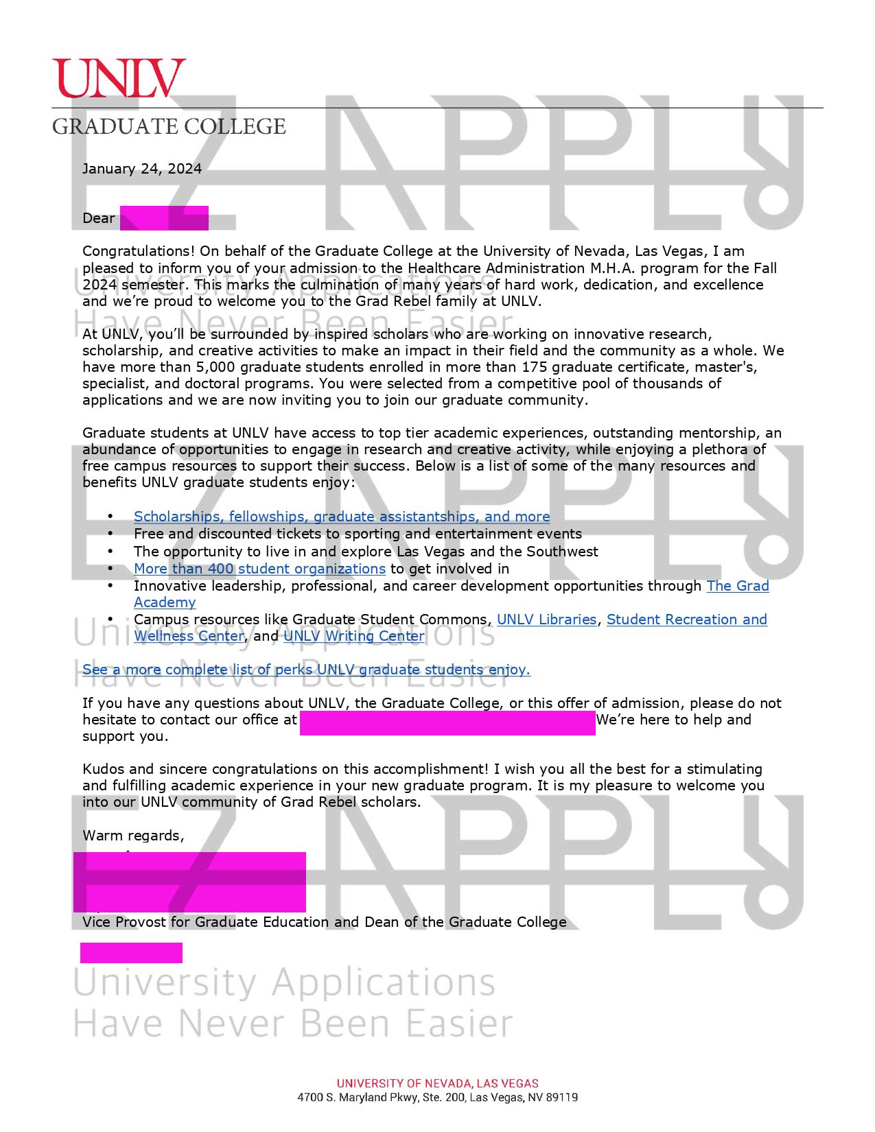 ادمیـشن اخذ شده توسط تیم ایزی اپلای در مقطع «کارشناسی ارشد» در رشته «Healthcare Administration» از University of Nevada Las Vegas از آمریکا برای پاییز 2024