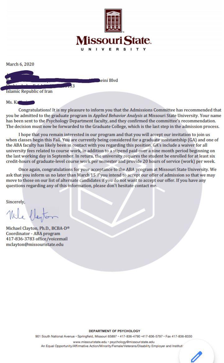 - اخذ پذیرش توسط تیم «ایزی اپلای» در مقطع کارشناسی ارشد رشته «روانشناسی» از دانشگاه «Missouri State» آمریکا برای ترم پاییز 2020
