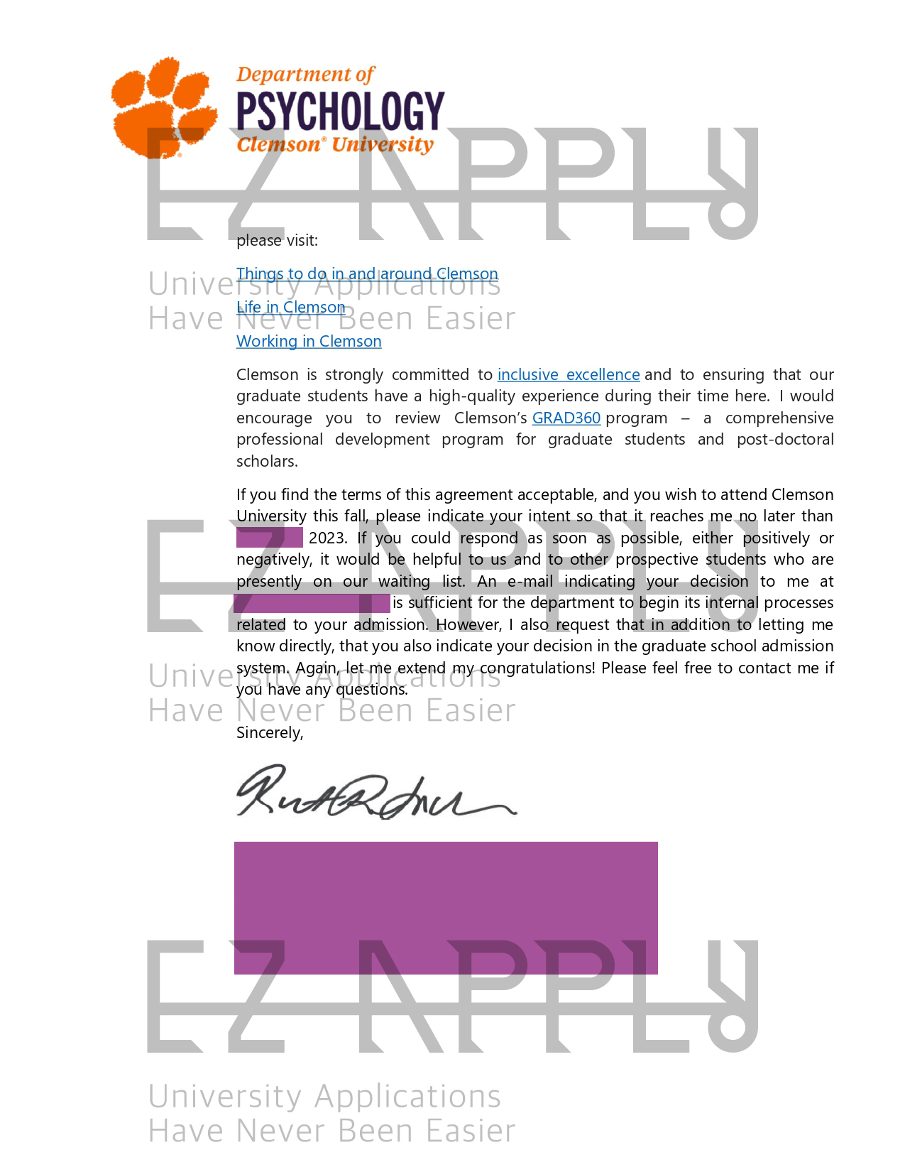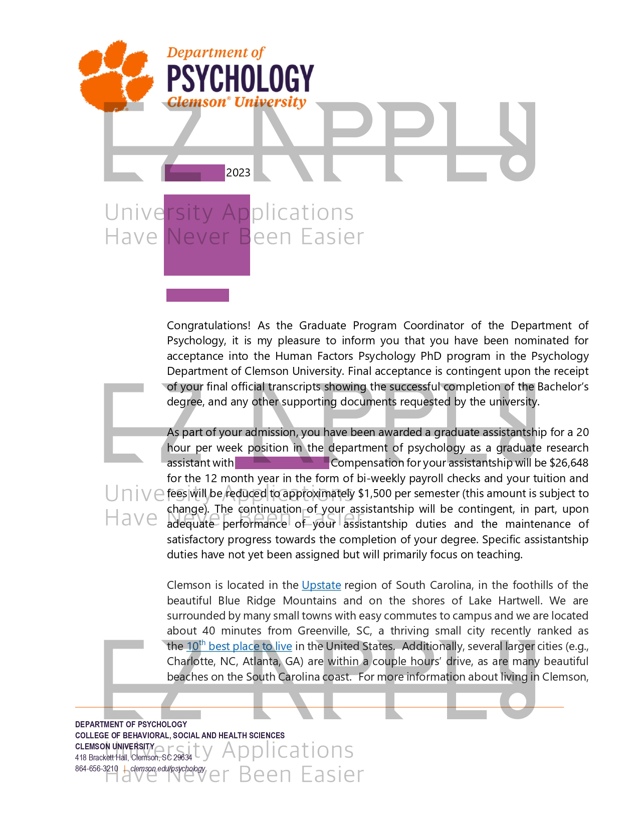 پذیرش اخذ شده توسط تیم ایزی اپلای در مقطع «دکتری» در رشته «Human Factors Psychology» از «Clemson University» در آمریکا برای پاییز 2023