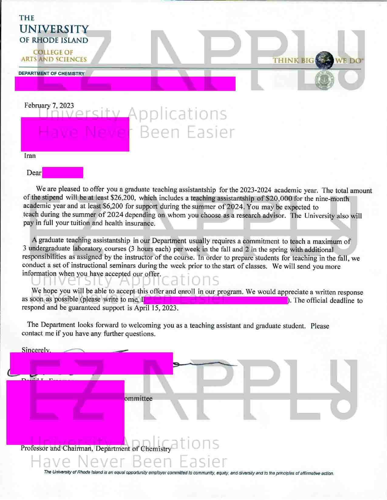 پذیرش فول فاند اخذ شده توسط تیم ایزی اپلای در مقطع «دکتری» در رشته «شیمی» از «University of Rhode Island» از آمریکا برای پاییز 2023