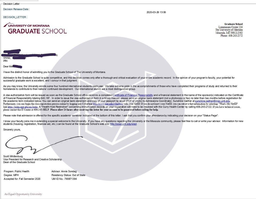 • اخذ پذیرش توسط تیم «ایزی اپلای» در مقطع کارشناسی ارشد رشته «بهداشت عمومی» از دانشگاه «Montana» در ایالت Montana آمریکا برای ترم پاییز 2020