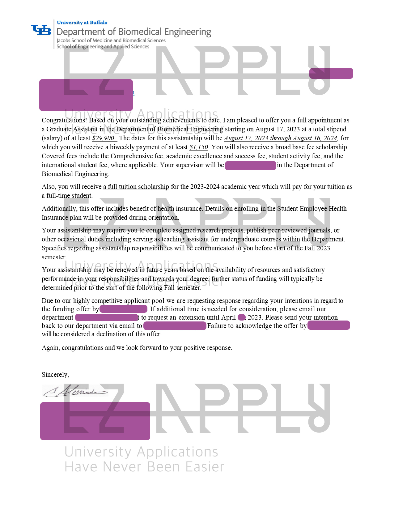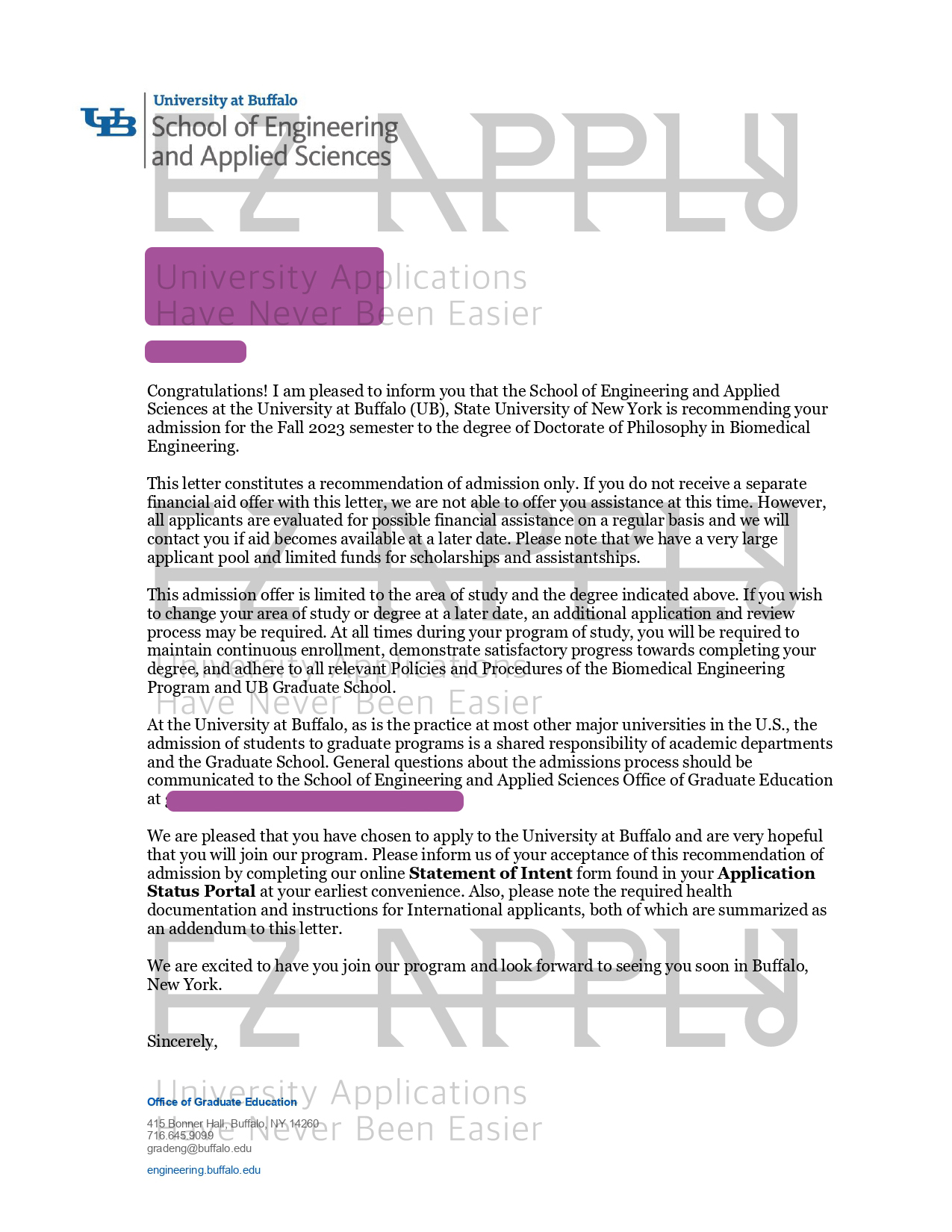 پذیرش فول فاند اخذ شده توسط تیم ایزی اپلای در مقطع «دکتری» در رشته «Biomedical Engineering» از «University at Buffalo» در آمریکا برای پاییز 2023