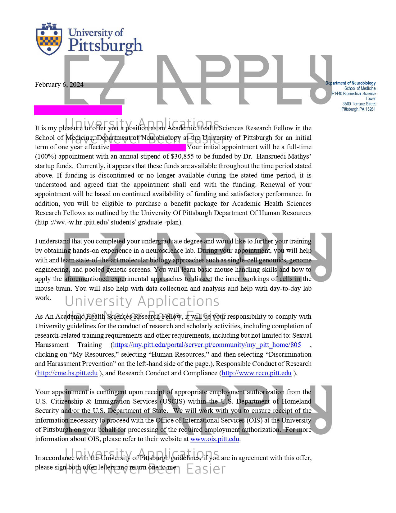 پوزیشن فول فاند اخذ شده توسط تیم ایزی اپلای به عنوان Academic Health Sciences Research Fellow از دانشگاه University of Pittsburgh در آمریکا برای پاییز 2024